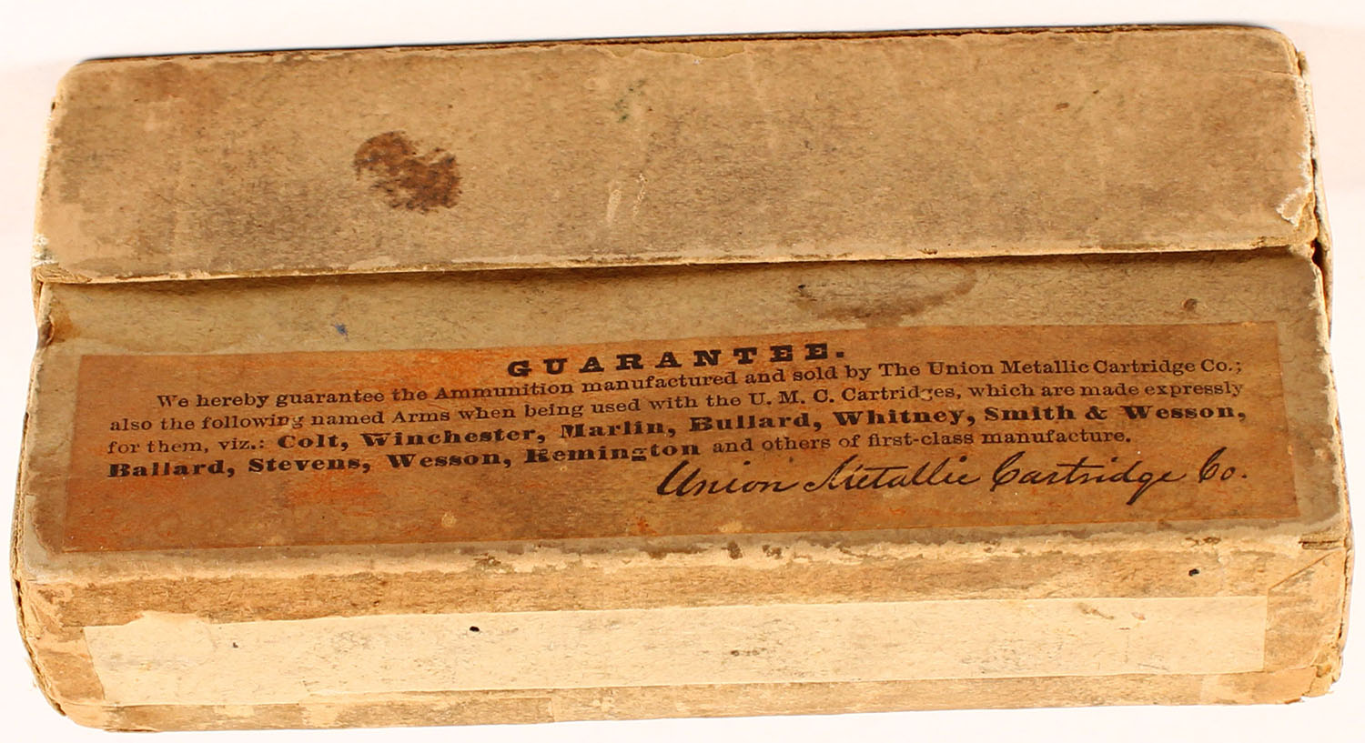 UMC, .32-40 Ballard & Marlin cal., 165 grs. bullet, Full, 2pc., buff box with green & black label, box has repaired seams and labels have minor scuffing and age soiling, ammo is excellent. Grade: Very Good - Value: 40 to 100