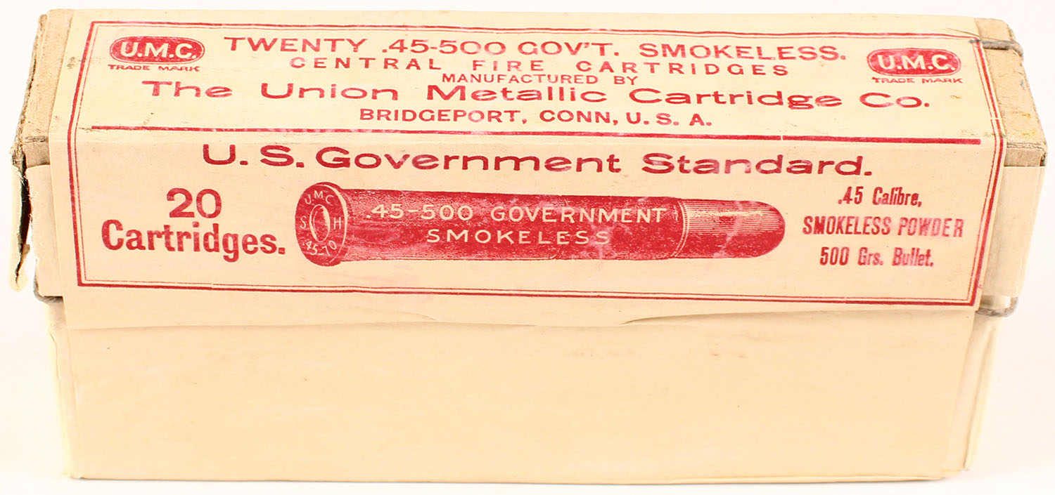 UMC, .45-500 GOV'T. Smokeless, Central Fire Cartridges, 2pc, Full & Sealed, buff box with red print, box is solid with 1 small seam split, bright and clean with great color. Grade: Excellent - Value: 50 to 250