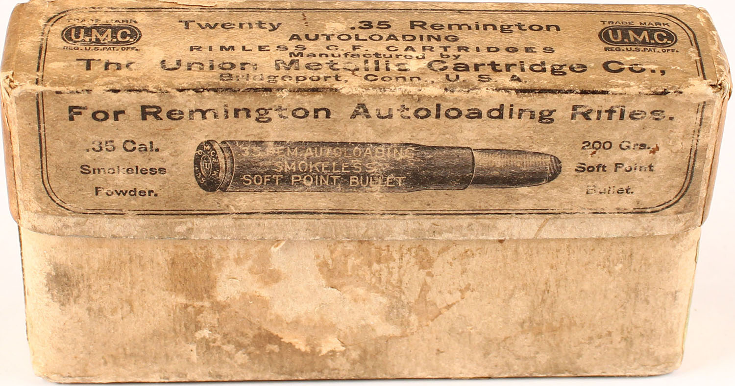 UMC, .35 Remington, Smokeless, 2pc, Full, buff box with buff and black print, box has age soiling and label has scuffing, ammo is excellent. Grade: Very Good - Value: 40 to 200