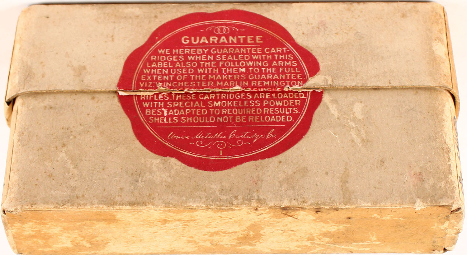 UMC, .30-30 Smokeless Short Range, Central Fire Cartridges, 2pc, Full, buff box with buff and black print, box is solid and label has scuffing and age soiling, ammo is excellent. Grade: Very Good + - Value: 40 to 100