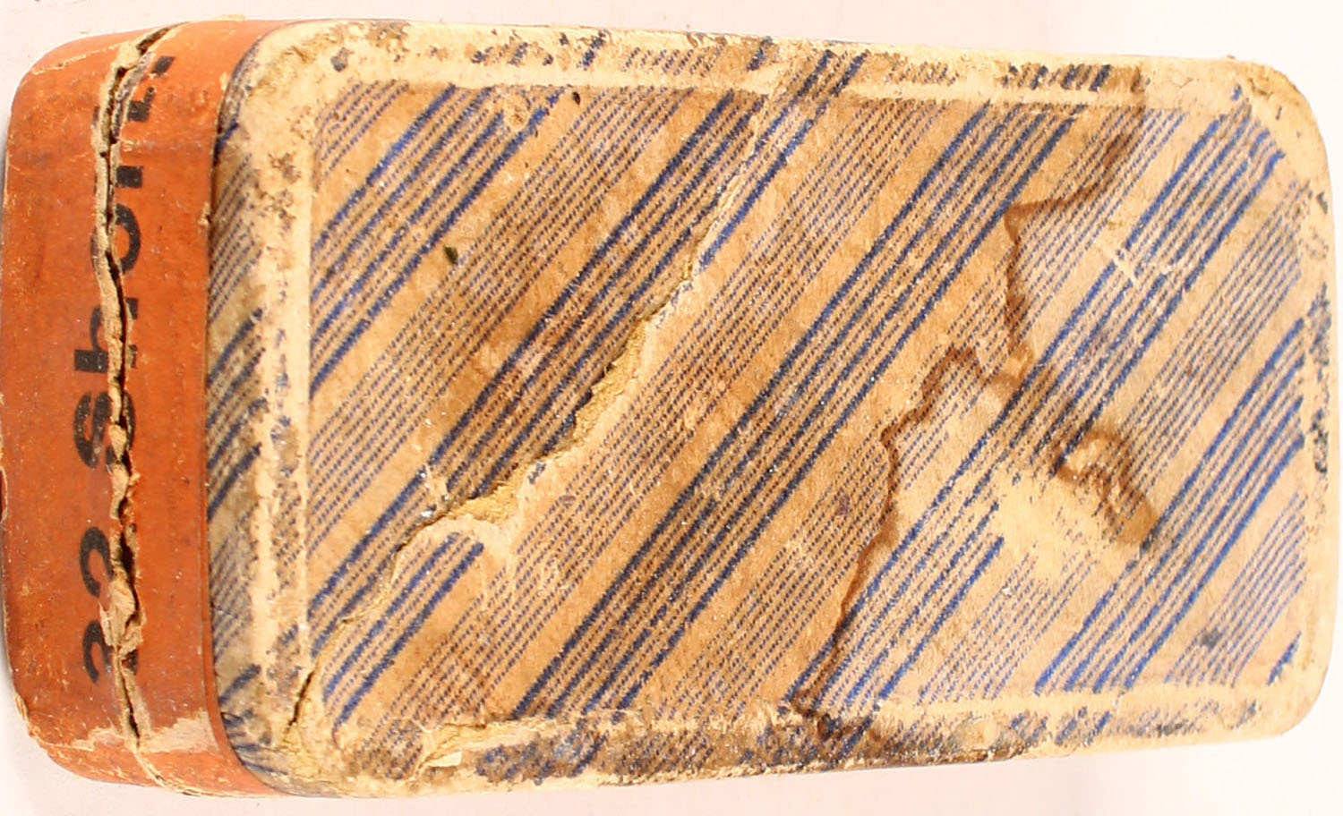 UMC, .32 Calibre Short, Dog head logo, Swaged Bullets, 2pc, Full fabric box with orange label & black print, box is solid with age stains, rub marks, edge wear & corer wear, ammo is good. (659) Grade: Very Good ++ - Value: 50 to 300