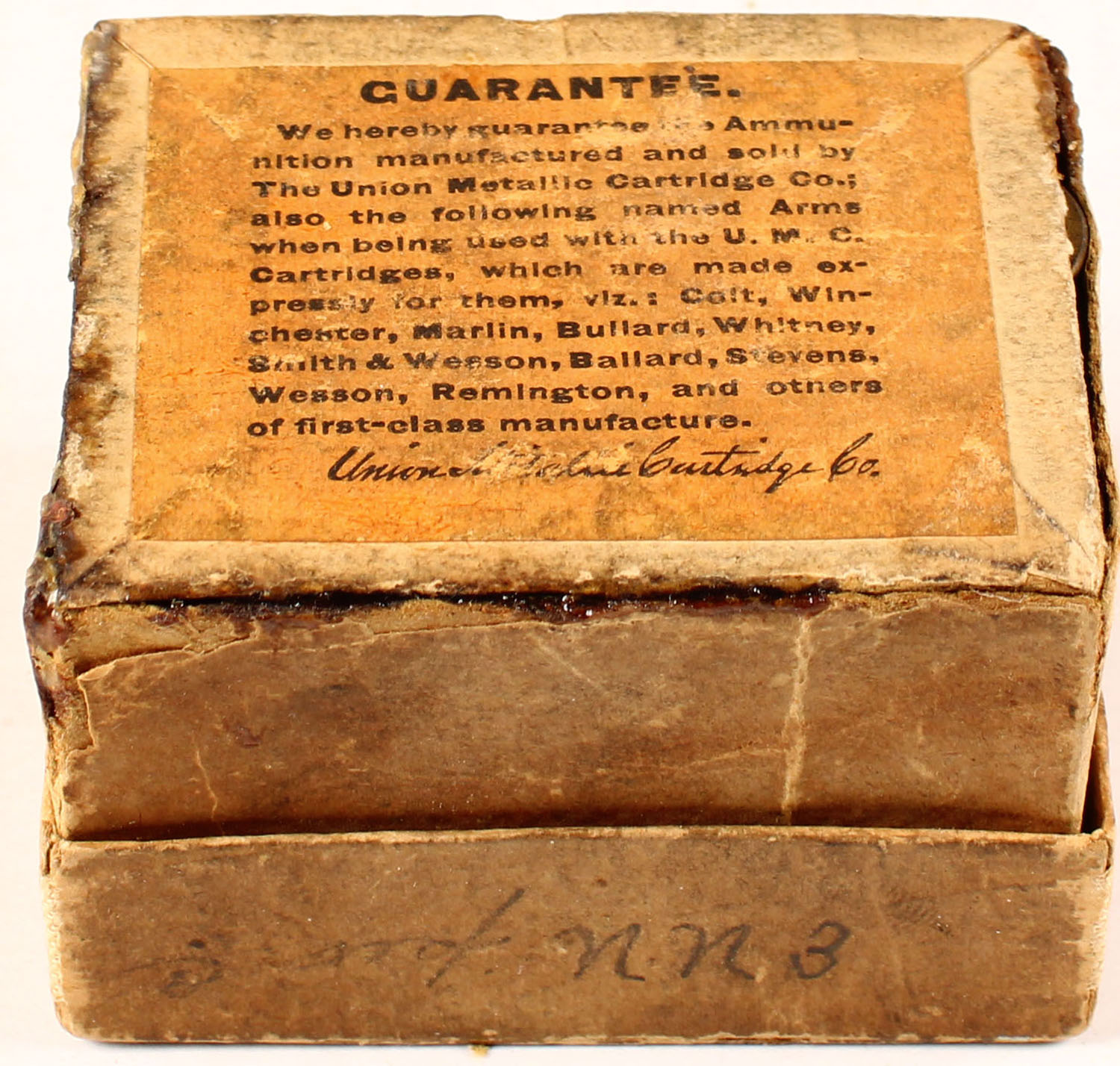 UMC, .50 cal. BLANKS, Full, 2pc. tan box with green top & no side sealing labels, box has weak bottom with age soiling and some edge & corner wear, labels has age soiling. Grade: Good ++ - Value: 14 to 150