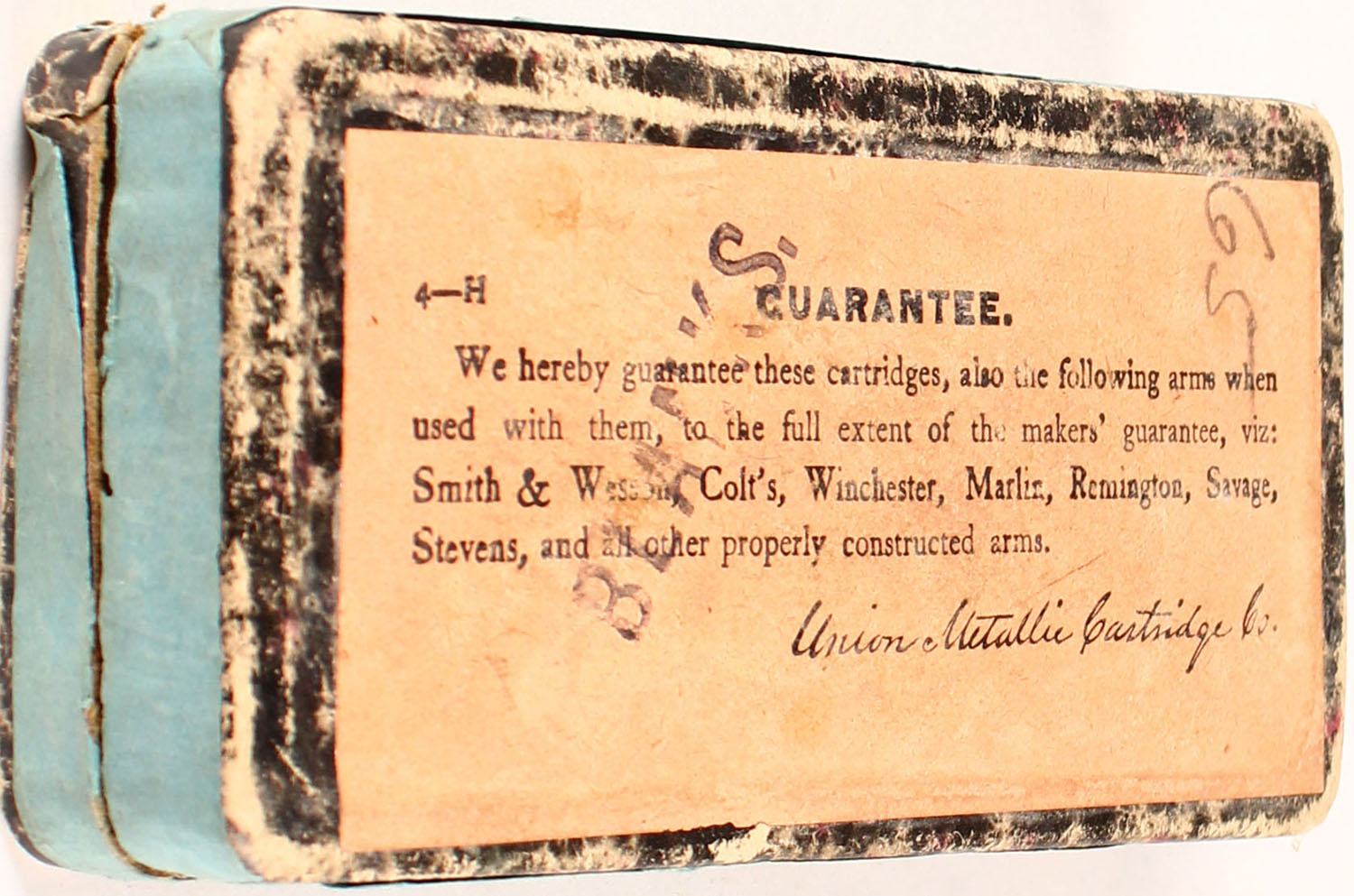 UMC, .44 Bulldog, BLANK stamped on bottom of box, appears to have had an over label over the loading info as it seems to lack age soiling like the rest of the box, 2pc, 43 rds. Of Blank Peters rds., buff box with green label & black print, box has scuffing wit good color to label, ammo is good. Grade: Very Good ++ - Value: 14 to 300