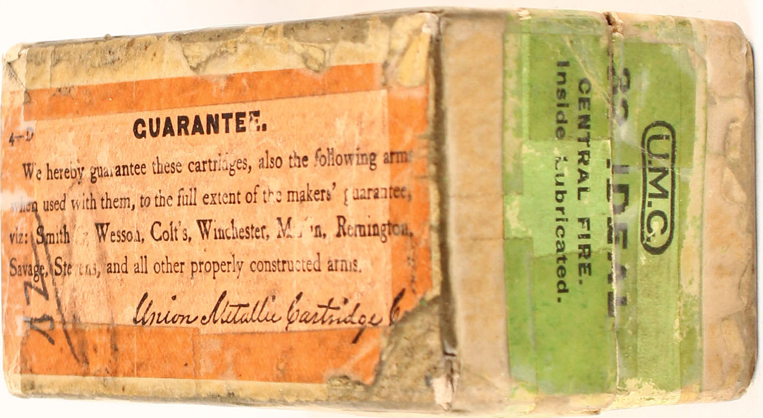 UMC, .32 Ideal, 25 Grs. Powder, 150 Grs. Bullet, Partial 9rds., 2pc. Buff box with green top & side sealing labels, box is solid with very good color, some age soiling, box has tape on all sides, front and bottom have been written on, minor edge & corner wear, labels are 99% intact, ammo is excellent. Grade: Very Good - Value: 10 to 60