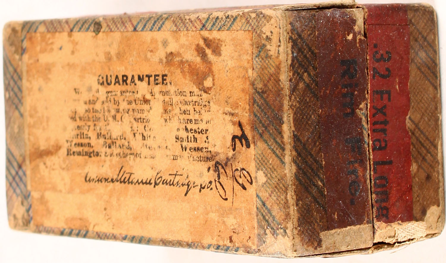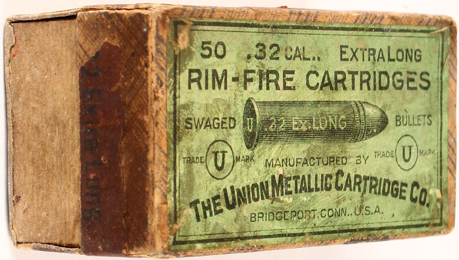 UMC, .32 Extra Long Rim Fire, Swaged Bullets, Full, 2pc. Fabric box with green top & orange side sealing labels, box is solid with good color, age soiling, right end missing from bottom, bottom shell has become disconnected from box, bottom has been written on, minor edge & corner wear, ammo is very good. Grade: Good ++ - Value: 30 to 90