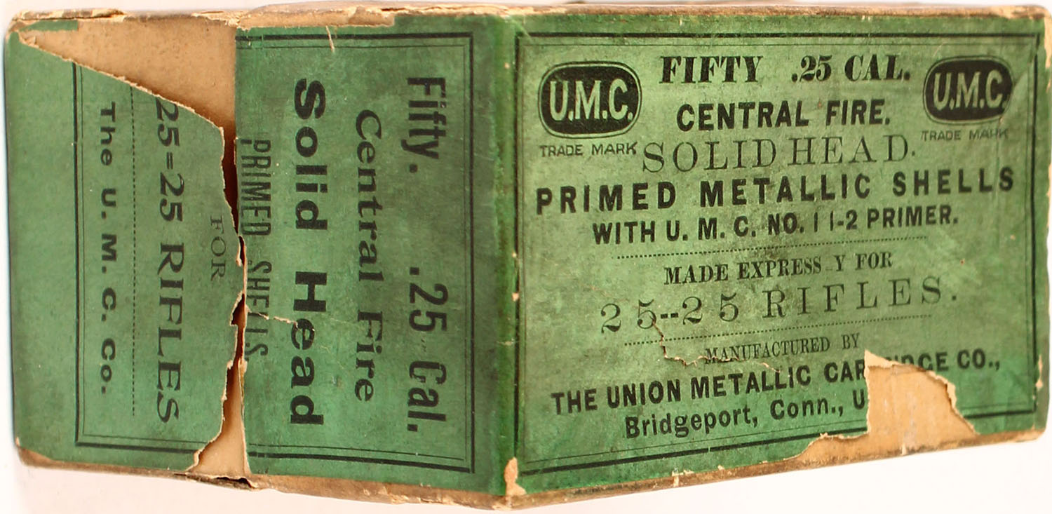 UMC, .25-25, Primed Metallic Shells, With UMC No 1 1-2 Primer, Full, 2pc. Buff box with green wraparound label, box is solid with good to very good color, age soiling, minor edge & corner wear, label is 80% intact, shells are excellent. Grade: Very Good + - Value: 10 to 50