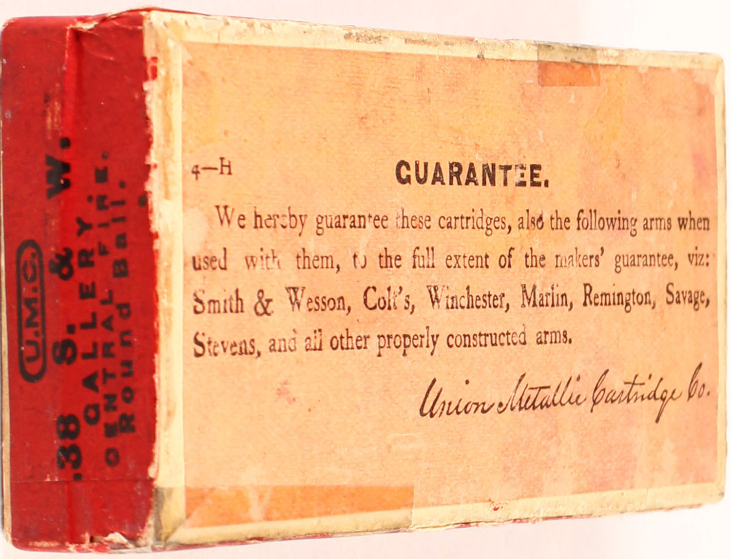 UMC, .38 Smith & Wesson Gallery Cartridges, With UMC No.1 Primer, FULL & SEALED, 2pc. Buff box with red top & side sealing labels, box is solid with excellent color, very minor age soiling, minor edge & corner wear, tape in several places, labels are intact. Grade: Excellent + - Value: 20 to 150