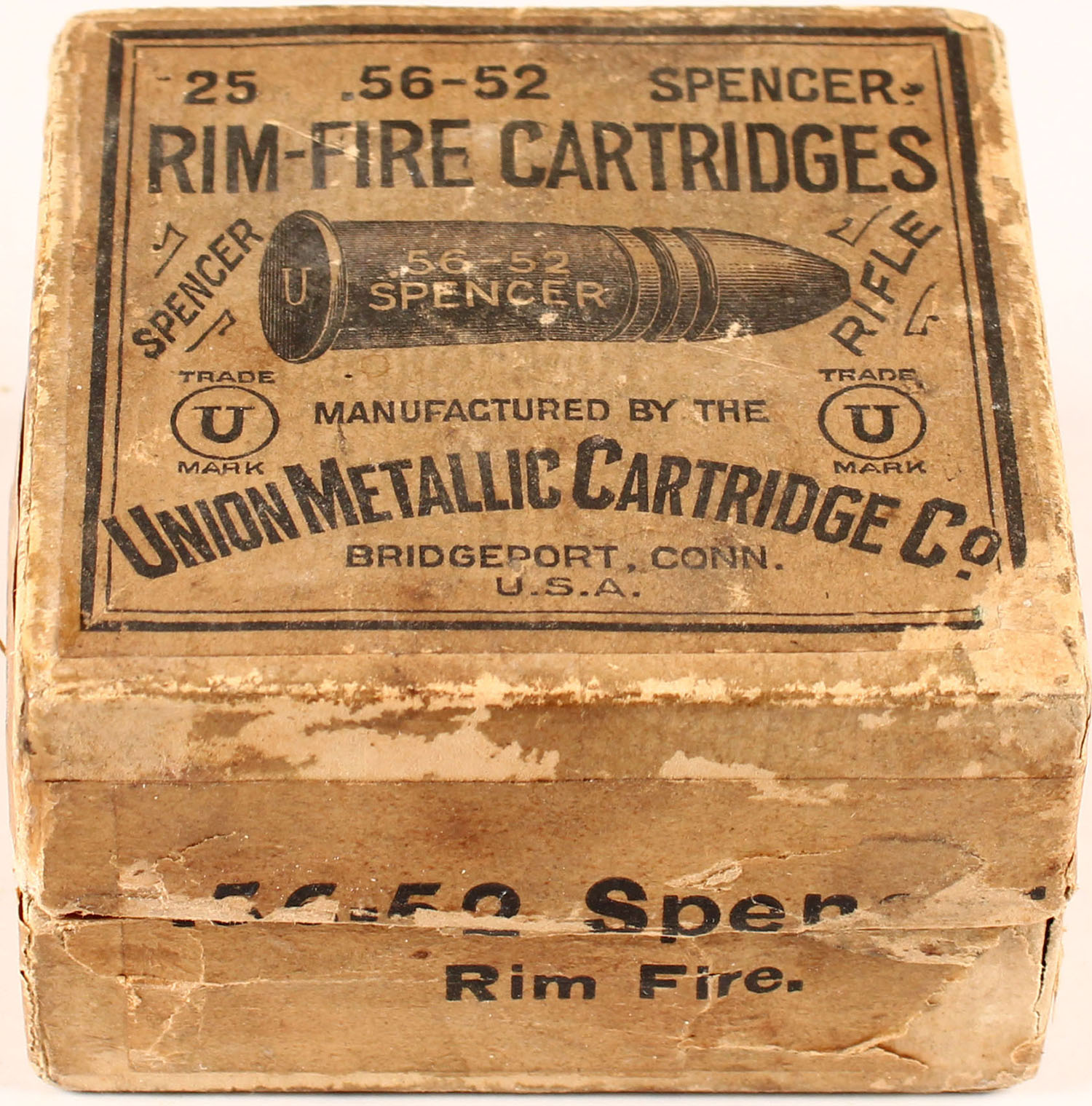 UMC, 56-52 Spencer, Rim-Fire Cartridges, Full, 2pc. Buff box with buff top & side sealing labels, box is solid with good to very good color, age soiling, shelf wear, some edge & corner wear, side sealing label is 99% intact, ammo is very good to excellent. Grade: Excellent + - Value: 200 to 600