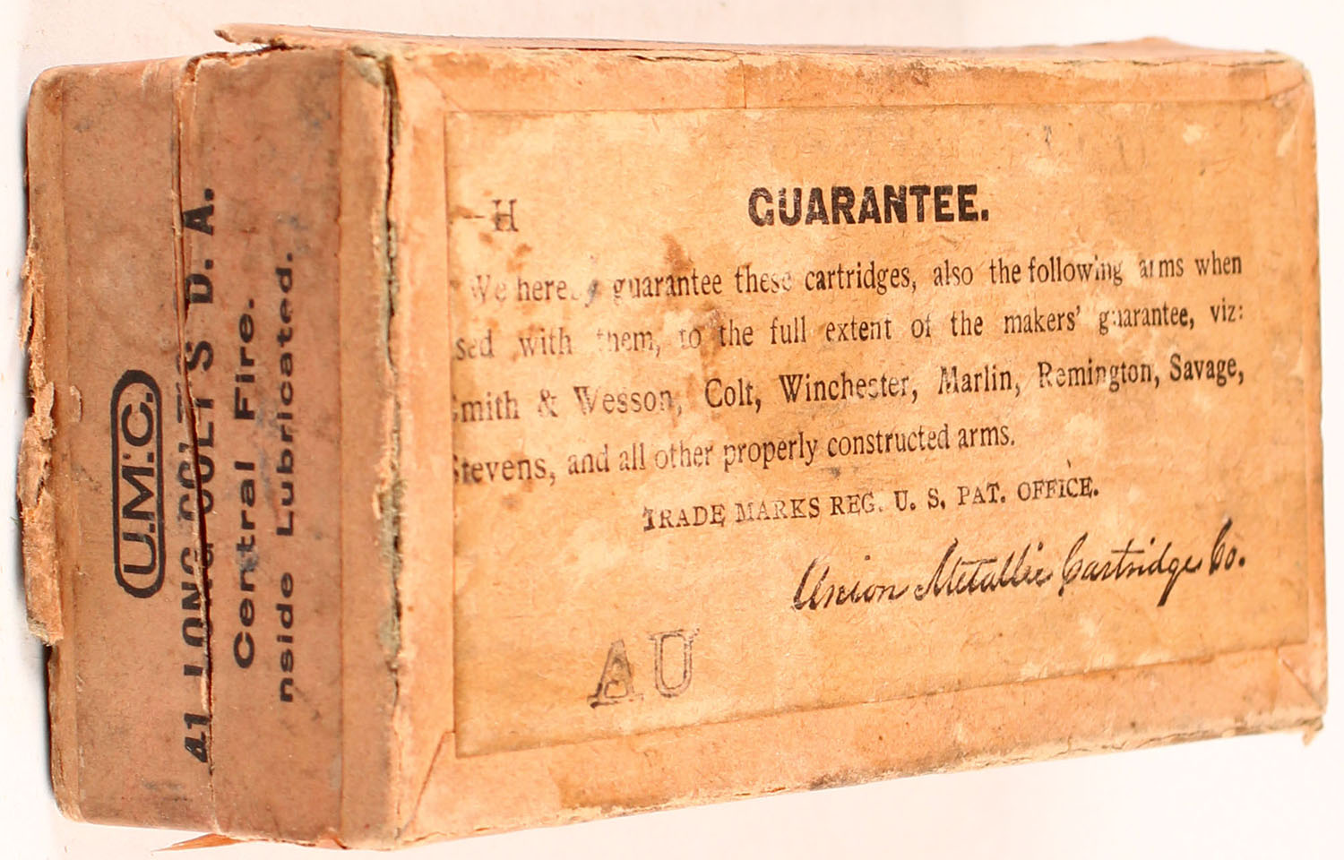 UMC, .41 Long Colt, 22 Grs. Powder, 195 Grs. Bullet, Partial 48rds., 2pc. Buff box with buff top & side sealing labels, box is solid with very good color, some age soiling & shelf wear, minor edge & corner wear, partial seam split to bottom front edge, labels are intact, ammo is very good to excellent. Grade: Very Good + - Value: 30 to 90