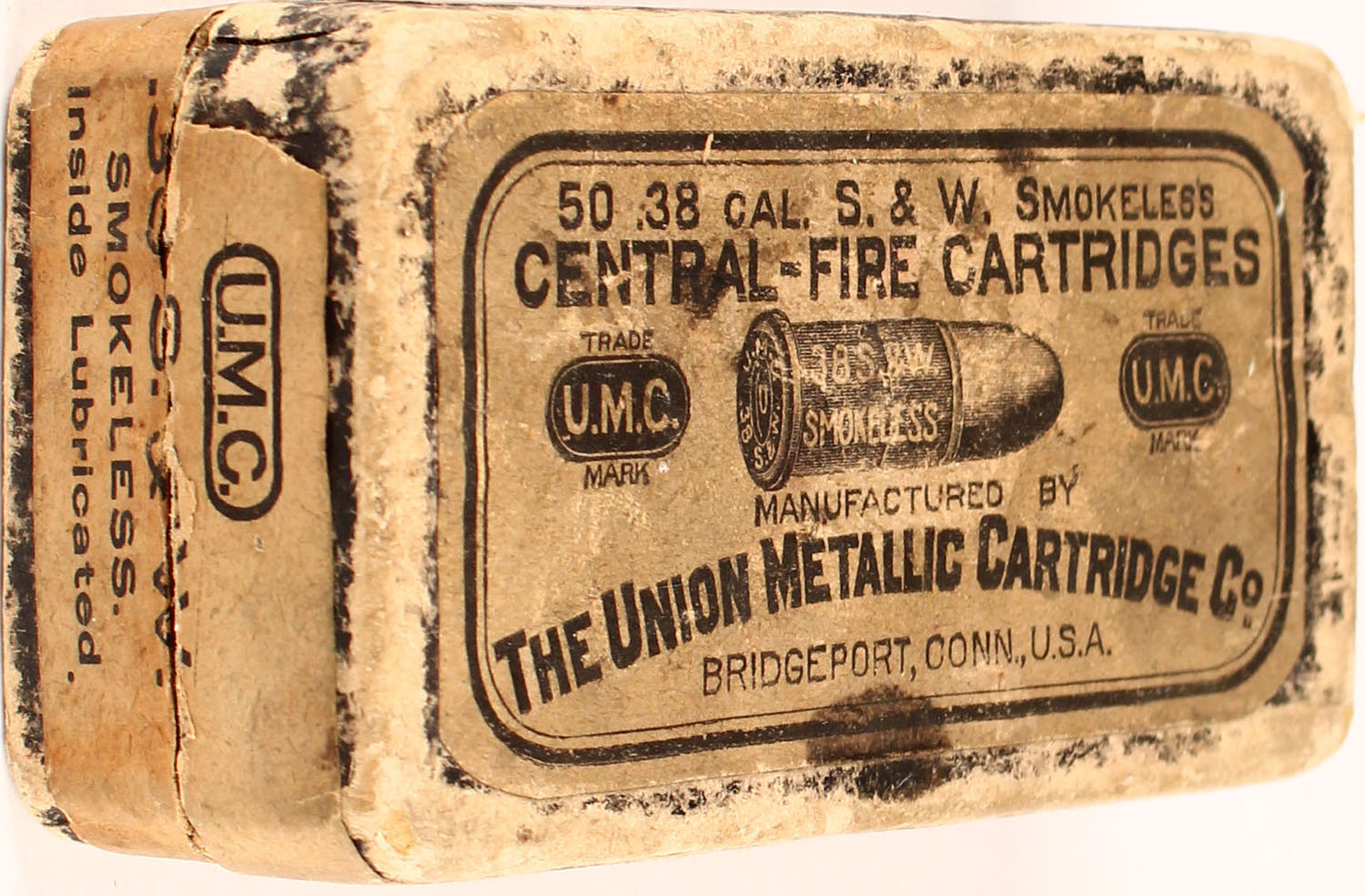 UMC, .38 Smith & Wesson, Smokeless, Full, 2pc. Buff box with buff top & side sealing labels, box is solid with good to very good color, age soiling, shelf wear, some staining to top, edge & corner wear, labels are intact, ammo is excellent. (126) Grade: Very Good ++ - Value: 10 to 90