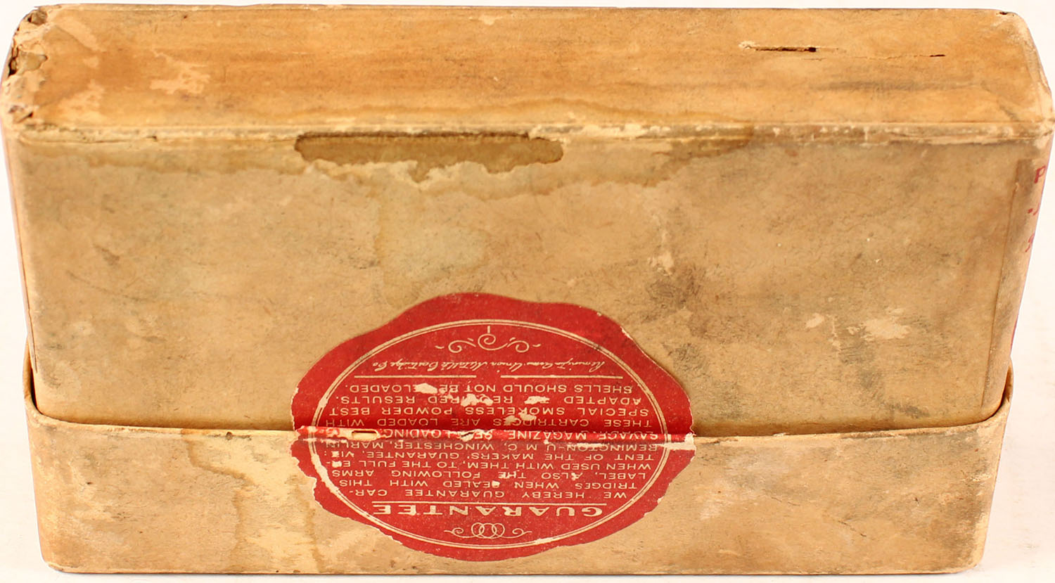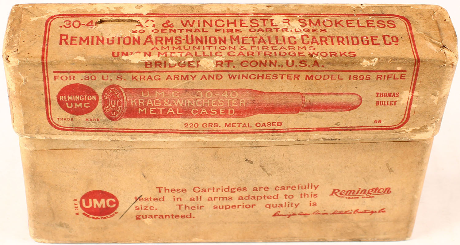 REM-UMC, .30-40 Krag, Smokeless Powder, 220 Grain Metal Cased Bullet, Full, 2pc. Buff box with buff labels, box is solid with very good to excellent color, some age soiling & shelf wear, minor corner wear, very minor edge wear, staining on back, labels are intact, ammo is very good to excellent. Grade: Excellent - Value: 20 to 60