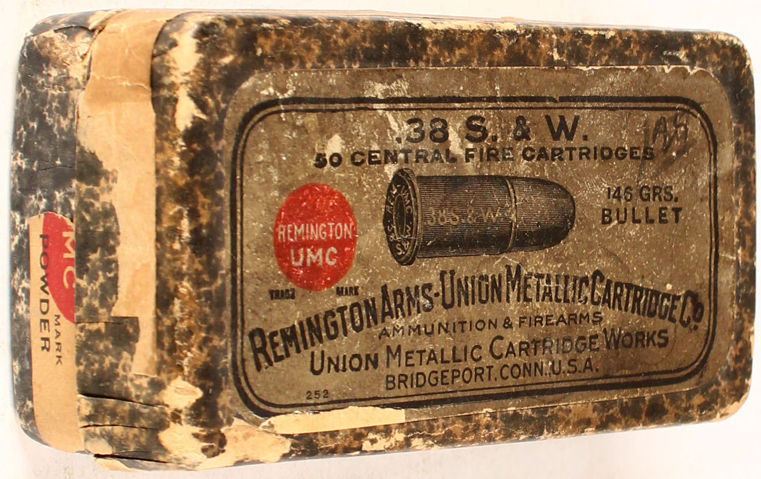 REM-UMC, .38 Smith & Wesson, Black Powder, 146 Grs. Bullet, Full, 2pc. Black mottled box with buff top & side sealing labels, box is solid with good color, age soiling, very soiled on top, some corner wear, minor edge wear, side sealing label is 75% intact, ammo is very good. Grade: Very Good + - Value: 20 to 60