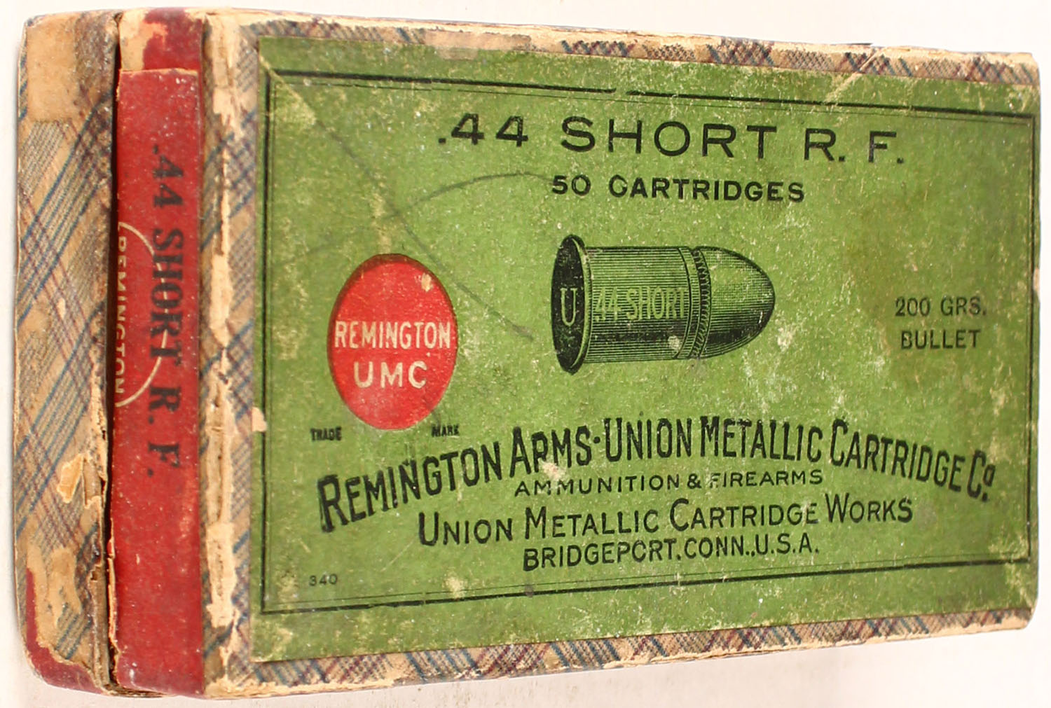 REM-UMC, .44 Short Rim Fire, Black Powder, 200 Grain Bullet, Partial 48rds., 2pc. Blue fabric box with green top & red side sealing labels, box is solid with very good color, some age soiling & shelf wear, some corner & edge wear, top has been written on, side sealing label is 50% intact, ammo is very good. Grade: Very Good + - Value: 70 to 200