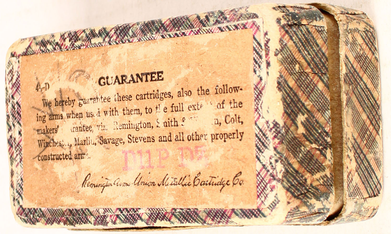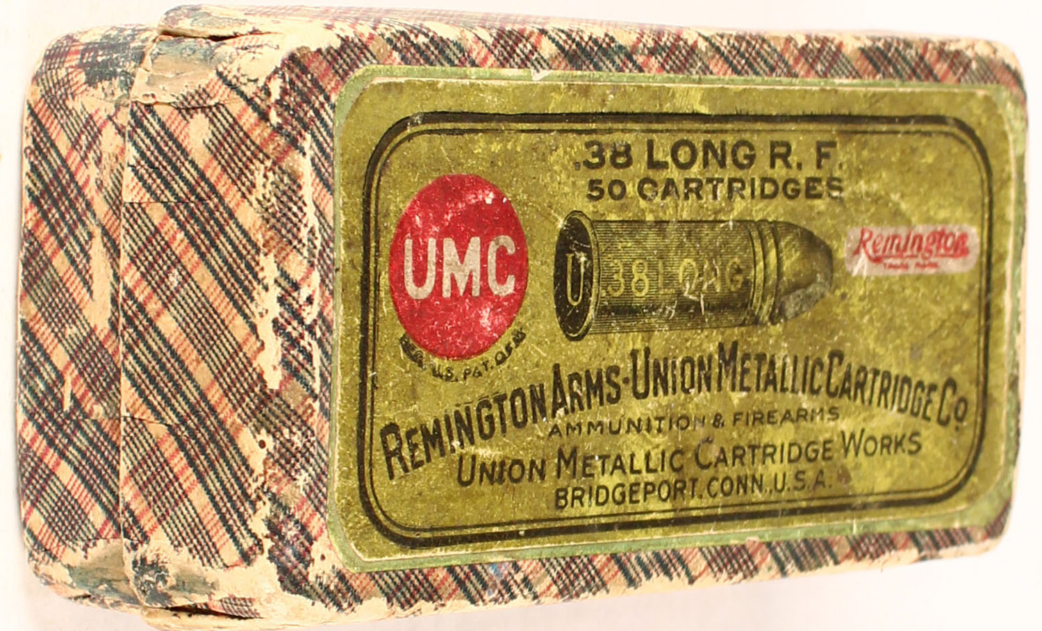 REM-UMC, .38 Long Rim Fire, Partial 29rds., 2pc. Dark blue fabric box with green top label & red side sealing label, box is solid with good color, age soiling, shelf wear, some edge & corner wear, bottom has been written on, side sealing label is 5% intact, ammo is good to very good. Grade: Very Good - Value: 10 to 60
