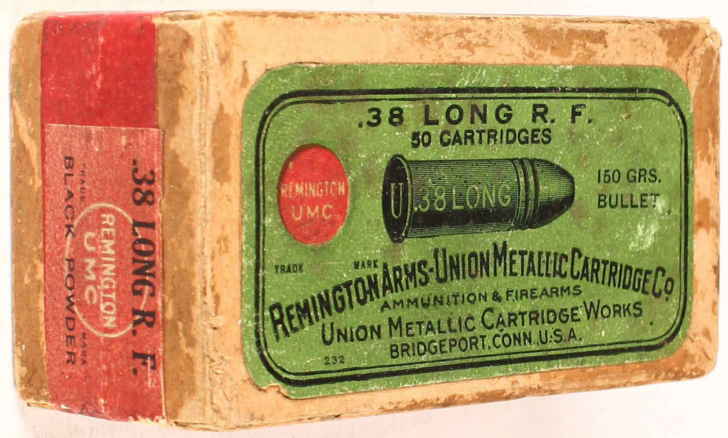 REM-UMC, .38 Long Rim Fire, Black Powder, 150 Grain Bullet, FULL & SEALED, 2pc. Buff box with green top & red side sealing label, box is solid with very good to excellent color, some age soiling & shelf wear, minor edge & corner ear, labels are intact. Grade: Excellent + - Value: 50 to 300