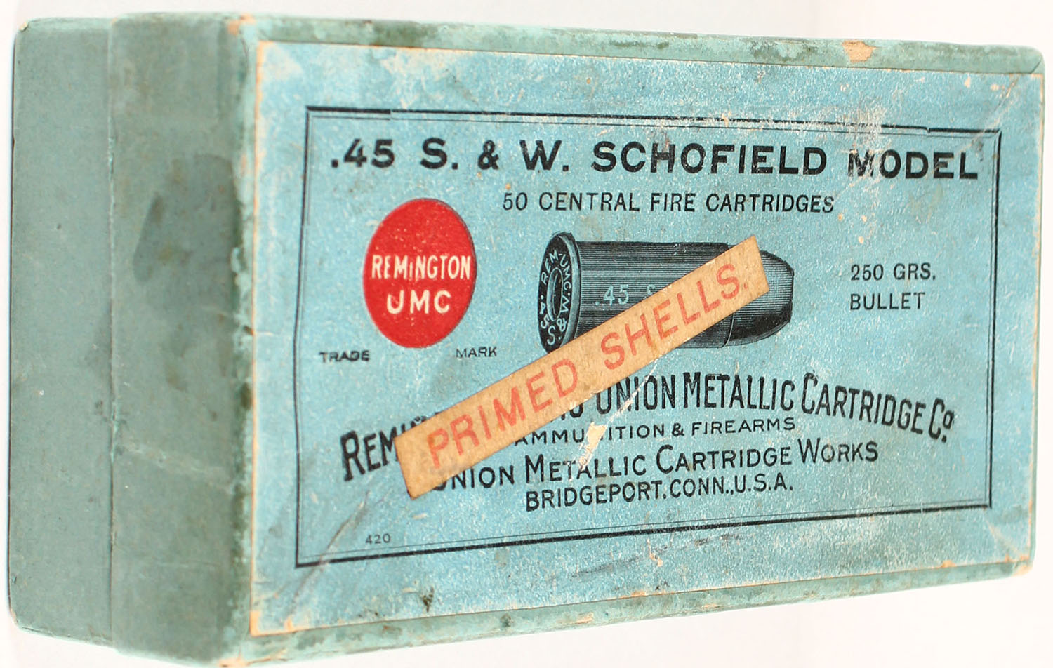 REM-UMC, .45 Smith & Wesson Schofield Model, Primed Shells, Full, 2pc. Blue box with blue top label & white ''Primed Shells'' Over-Label, box is solid with very good color, minor age soiling & shelf wear, minor corner wear, very minor edge wear, some staining, label is intact, ammo is excellent. Grade: Excellent - Value: 20 to 60