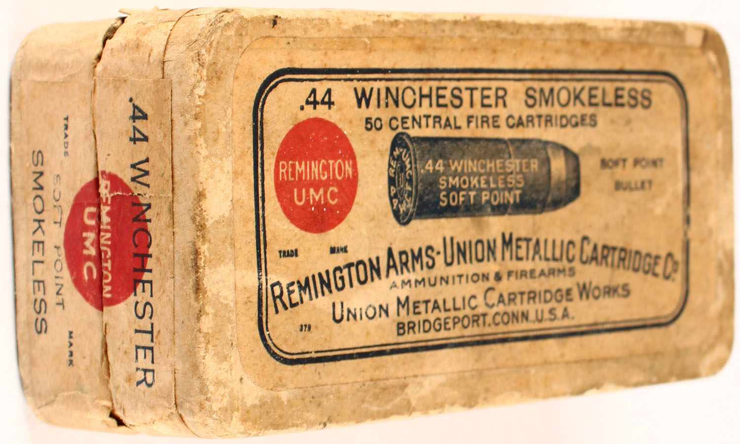 REM-UMC, .44 Winchester, Smokeless Powder, Soft Point Bullet, Full, 2pc. Buff box with buff top & side sealing label, box is solid with very good color, some age soiling & shelf wear, very minor edge & corner wear, labels are intact, ammo is excellent. Grade: Excellent - Value: 50 to 150