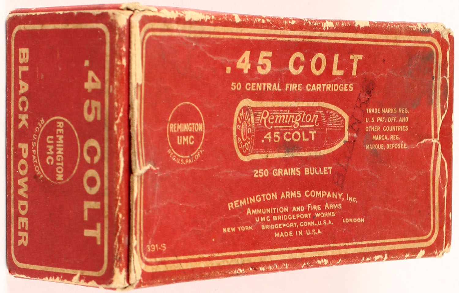 Remington, .45 Colt, OVERSTAMP ''BLANKS'', black powder, 1pc, Full, red box with white print, box is solid with handling wear, rub marks, edge wear & corner wear, ammo is excellent. Grade: Very Good ++ - Value: 30 to 90
