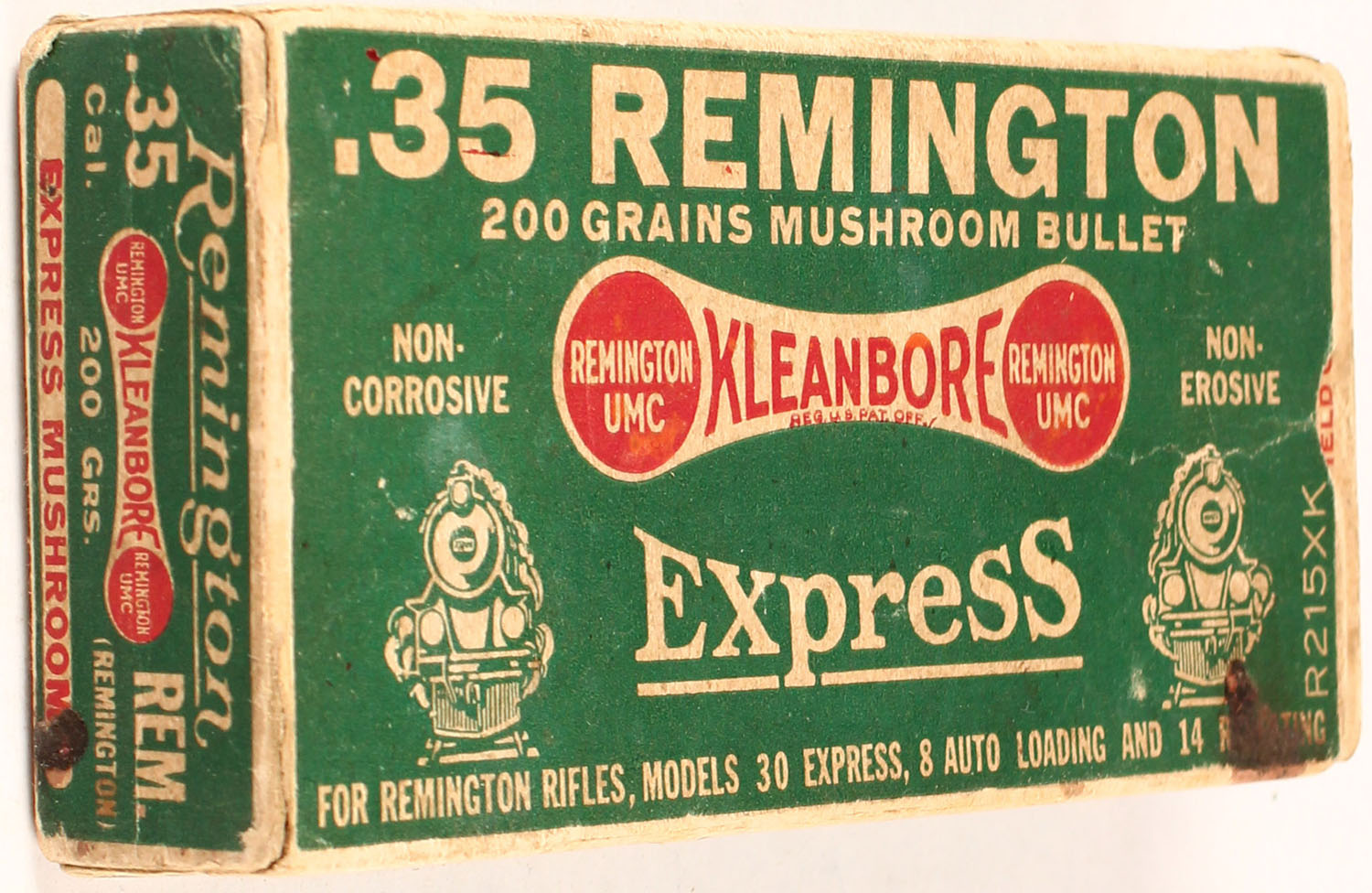Remington, Kleanbore Express, .35 Remington, 200 Grains Mushroom Bullet, Full, 1pc. Green white & red dog bone/train box, box is solid with very good to excellent color, some age soiling, stain on top, right end flap has been torn & taped, minor edge & corner wear, left end flap is solid, ammo is very good to excellent. Grade: Very Good + - Value: 40 to 120