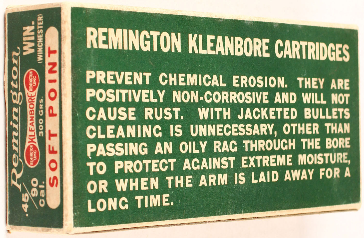 Remington, Kleanbore, .45-90 Winchester and Marlin, 300 Grains Soft Point Bullet, Full, 1pc. Green white & red dog bone box, box is solid with excellent color, very minor age soiling, corners are mostly sharp, edges are crisp, end flaps are solid, ammo is excellent. Grade; Excellent ++ - Value: 100 to 300