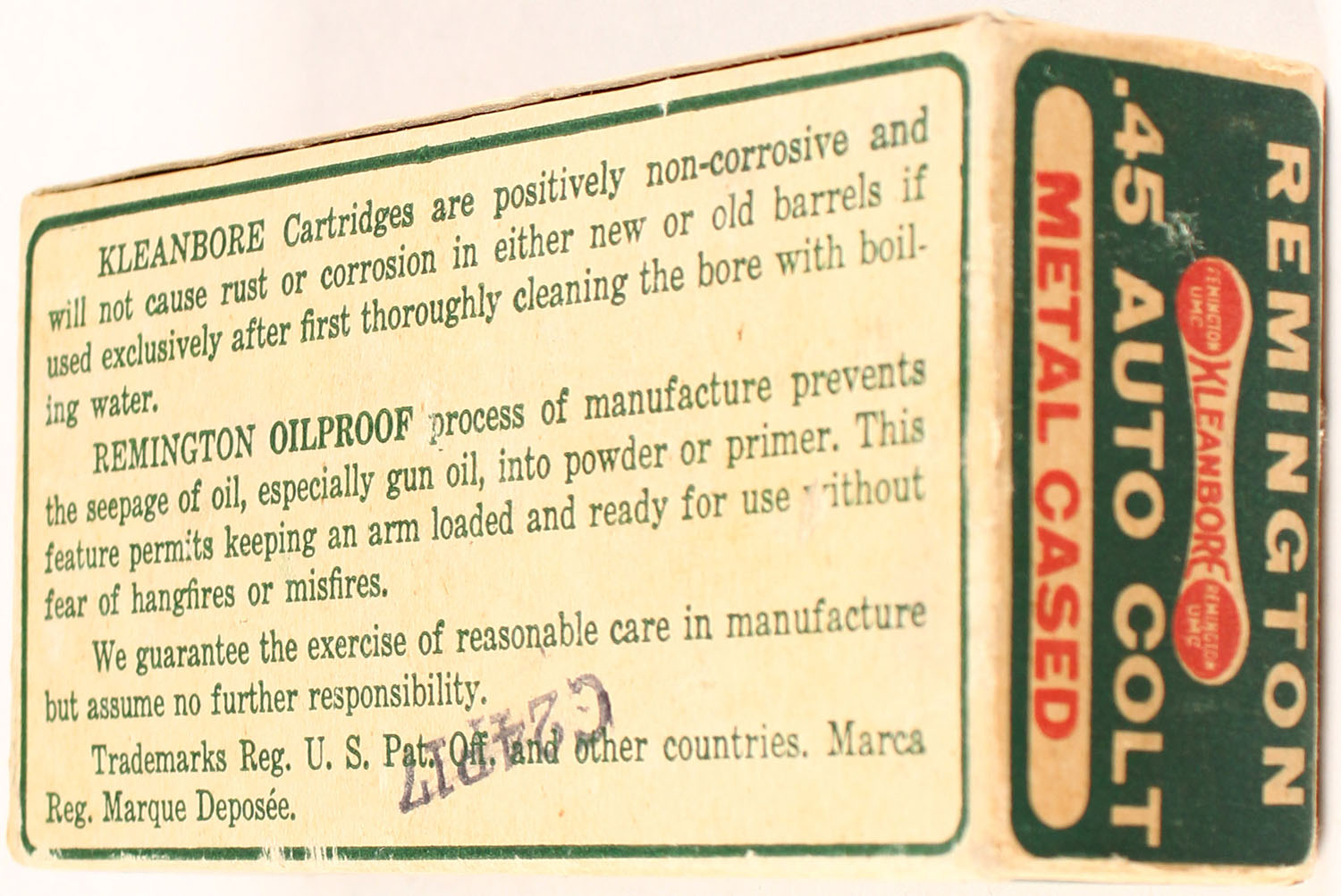 Remington, Kleanbore, .45 Automatic Colt, 230 Grs. Metal Cased Bullet, Full, 1pc. Green white & red dog bone box, box is solid with excellent color, minor age soiling, end flaps are solid, ammo is excellent. Grade: Excellent - Value: 40 to 200