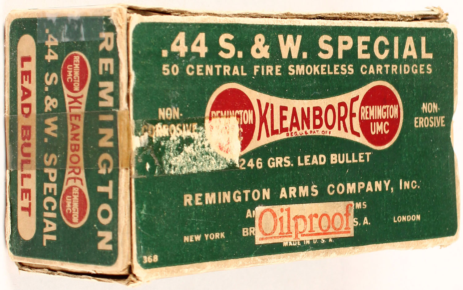 Remington, Kleanbore, .44 S&W Special, 246 Grains Lead Bullet, Partial 46rds., 1pc. Green white & red dog bone box, box is missing one end flaps & has a seam split to top, has nice color with over label Oilproof, ammo is excellent. Grade: Very Good - Value: 20 to 100