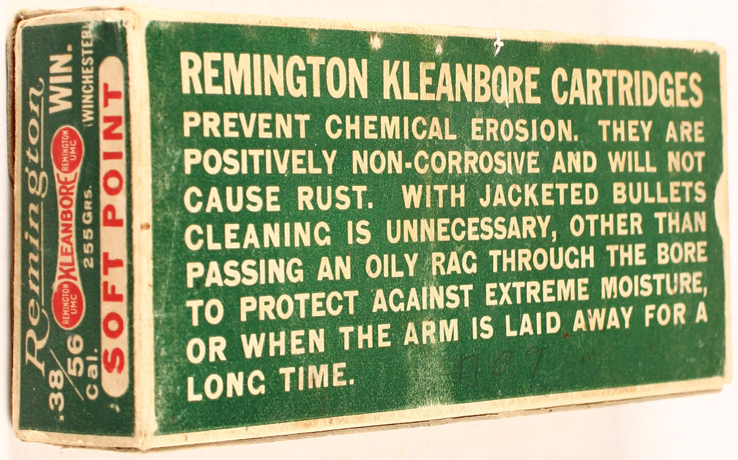 Remington, Kleanbore, .38-56 Winchester & Marlin, 255 Grs. Soft Point Bullet, Full, 1pc. Green white & red dog bone box, box is solid with excellent color, minor age soiling, end flaps are solid, ammo is excellent. Grade: Excellent - Value: 40 to 200