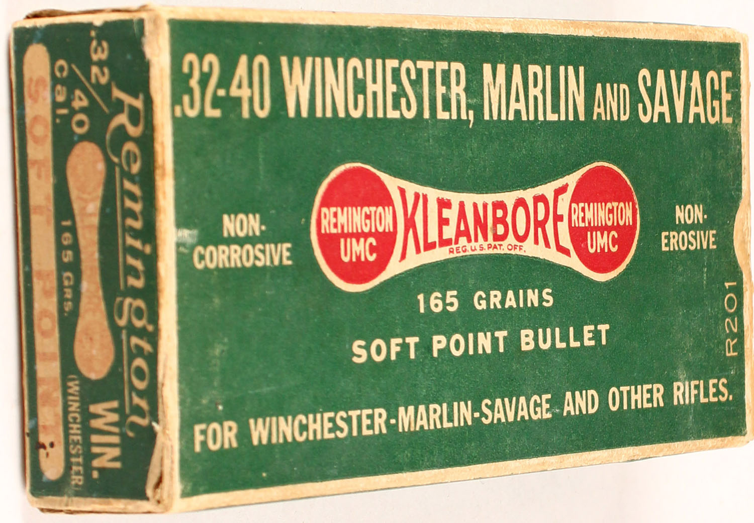 Remington Kleanbore, .32-40 Winchester, Marlin and Savage, 165 Gr. Soft Point Bullet, 1pc, Full, buff box with green label & white/red print, box is solid with light age soiling, ammo is excellent. Grade: Very Good ++ - Value: 30 to 150