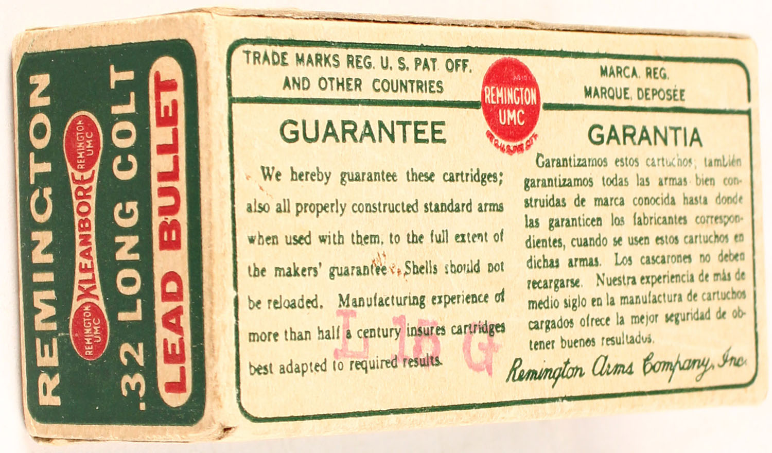 Remington, Kleanbore, .32 Long Colt, 82 Grain Lead Bullet, Full, 1pc. Green red & white box, box is solid with excellent color, end flaps are solid, ammo is excellent to minty. Grade: Excellent ++ - Value: 50 to 200