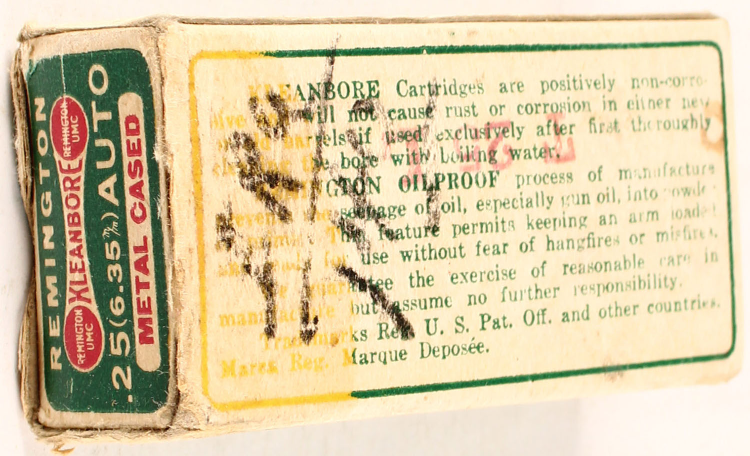 Remington, Kleanbore, .25 (6.35m/m) Automatic, 50 Grain Metal cased Bullet, Partial 40rds., 1pc. Green red & white box, box has one loose flap with excellent color, ammo is excellent. Grade: Very Good ++ - Value: 10 to 60