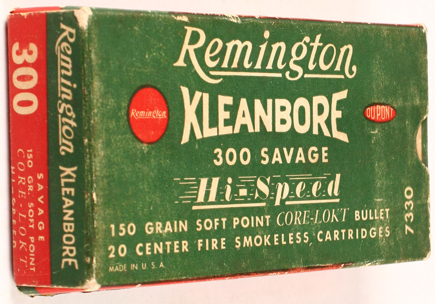 Remington, Kleanbore Hi-Speed, 300 Savage, 150 Grain Soft Point Bullet, Full, 1pc. Green red & white box, box is solid with excellent color, one tape repair, very minor age soiling, end flaps are solid, ammo is excellent. Grade: Very Good ++ - Value: 20 to 100