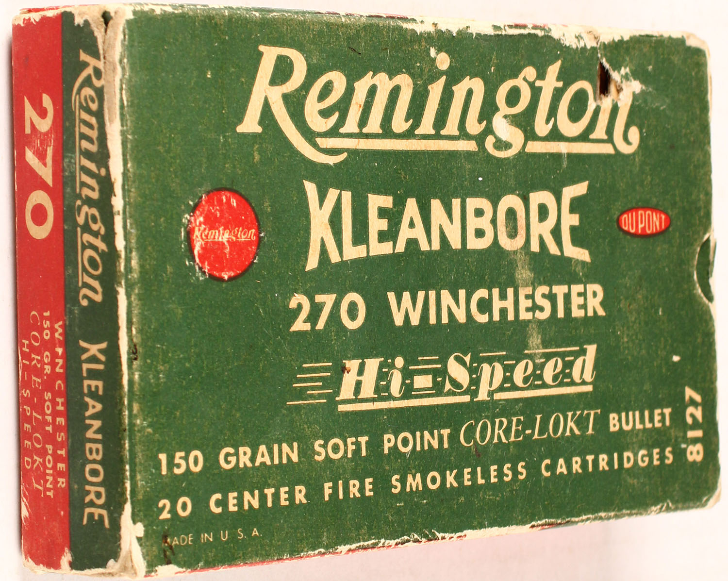 Remington, Kleanbore Hi-Speed, .270 Winchester, 150 Grain Soft Point Bullet, Full, 1pc. Green red & white box, box is solid with edge wear & a small hole on front, ammo is excellent. Grade: Very Good + - Value: 20 to 90