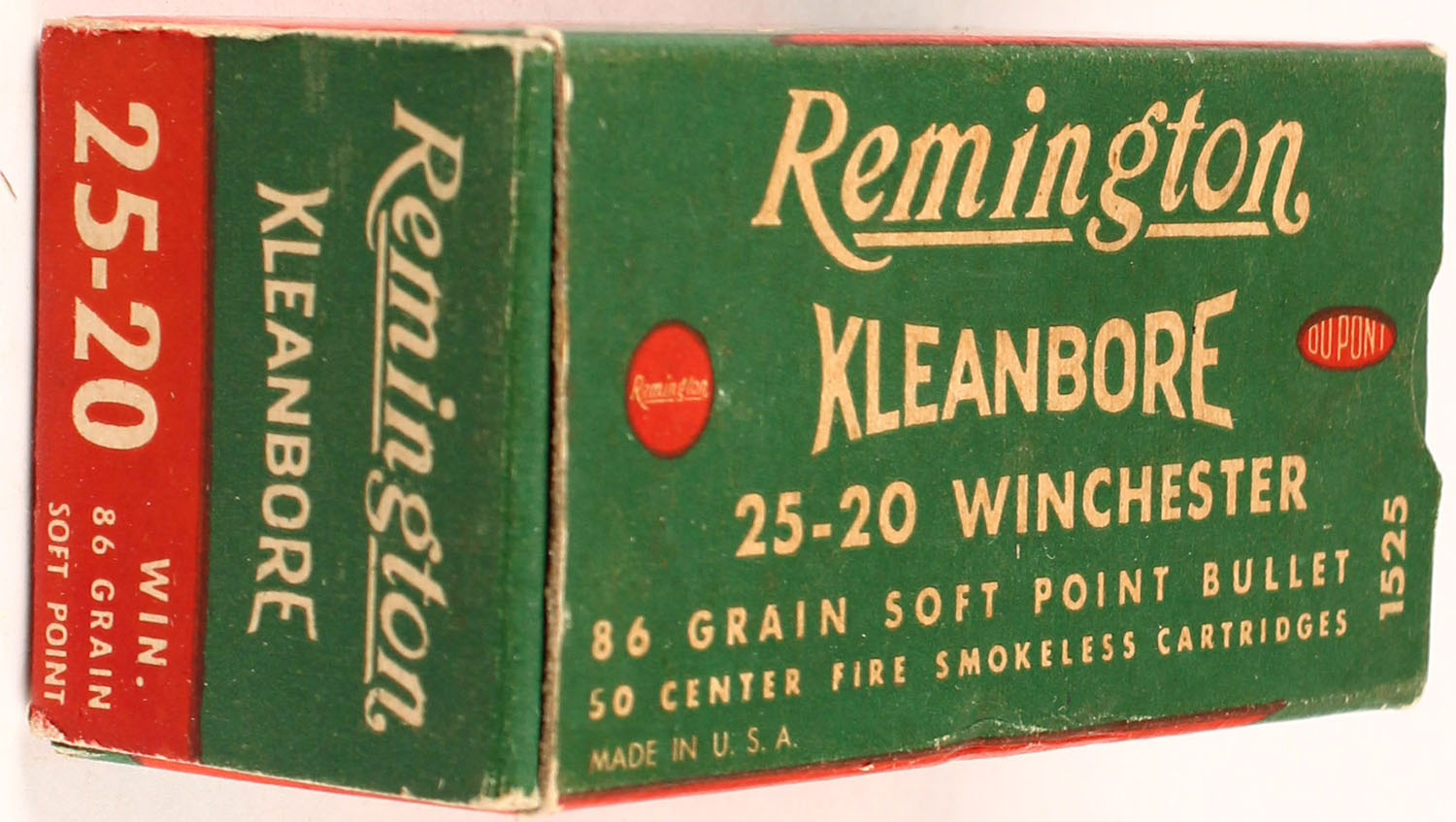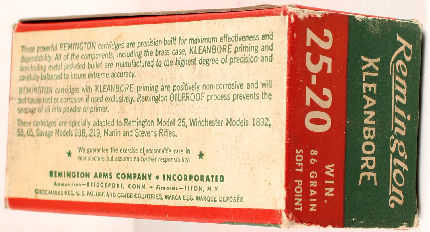 Remington .25-20 Winchester, 1pc., Full, Kleanbore, 86 Gr. Soft Point Bullet, green, red & white box, box is solid, ammo is excellent. Grade: Excellent - Value: 30 to 250