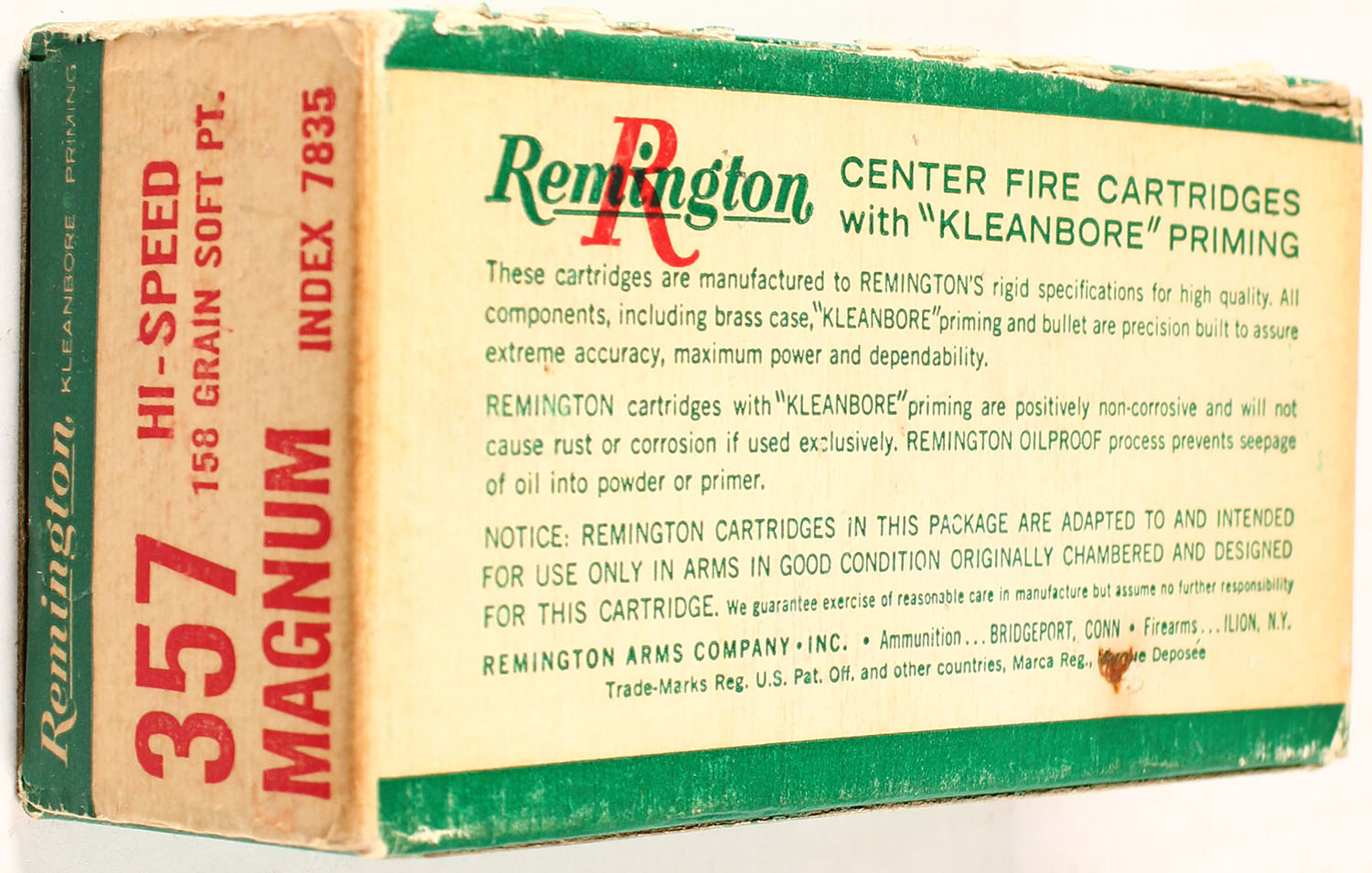 Remington, .357 Mangum, 158 Gr. Soft Point, 1pc, Full, green box with red/white print, box is solid with great colors, ammo is mint. Grade: Excellent + - Value: 20 to 60