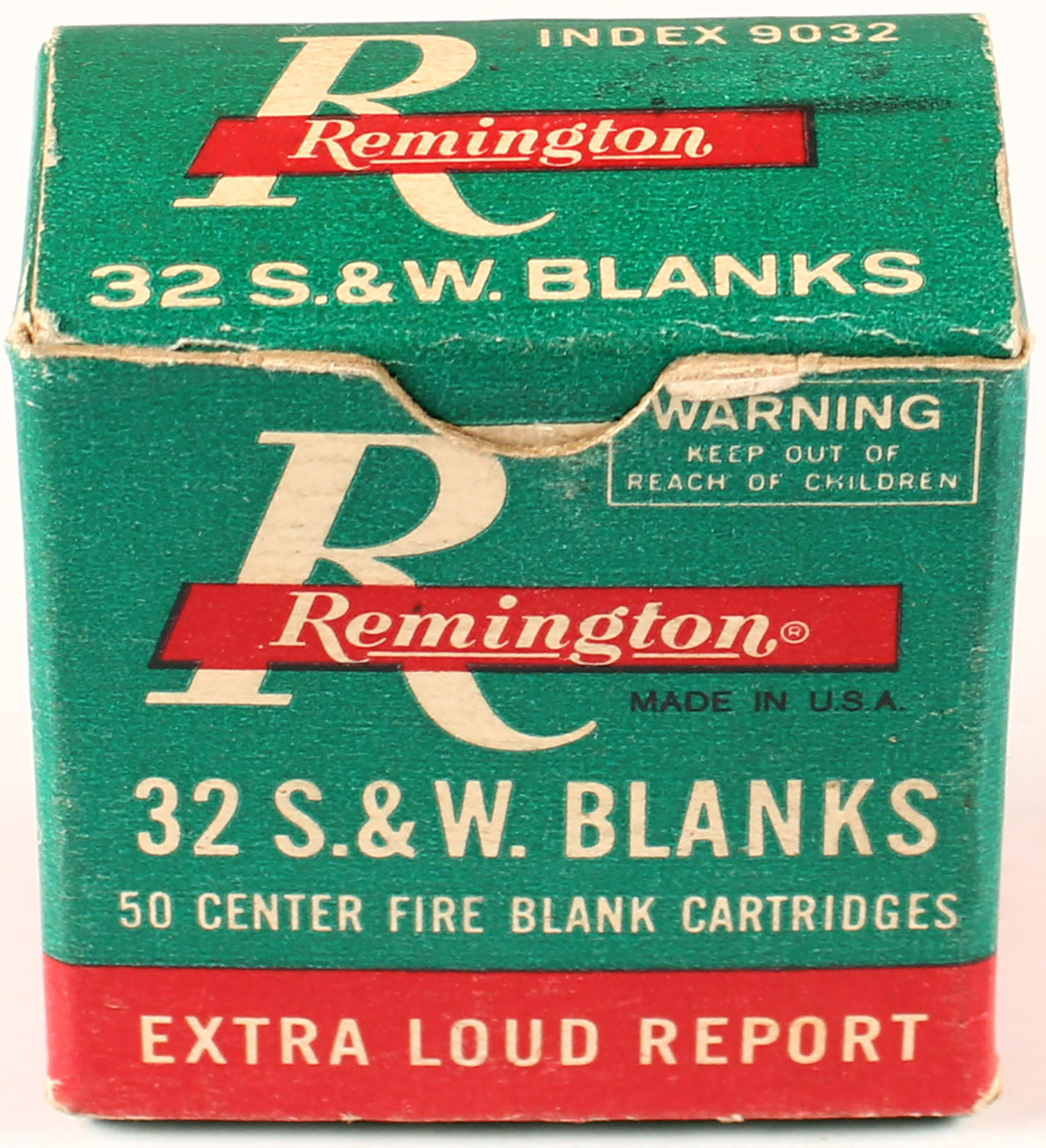 Remington, .32 S&W Blanks, Extra Loud Report, 1pc, 90% Full, green box with red/white print, box is solid with nice colors, ammo is excellent. Grade: Excellent + - Value: 10 to 50