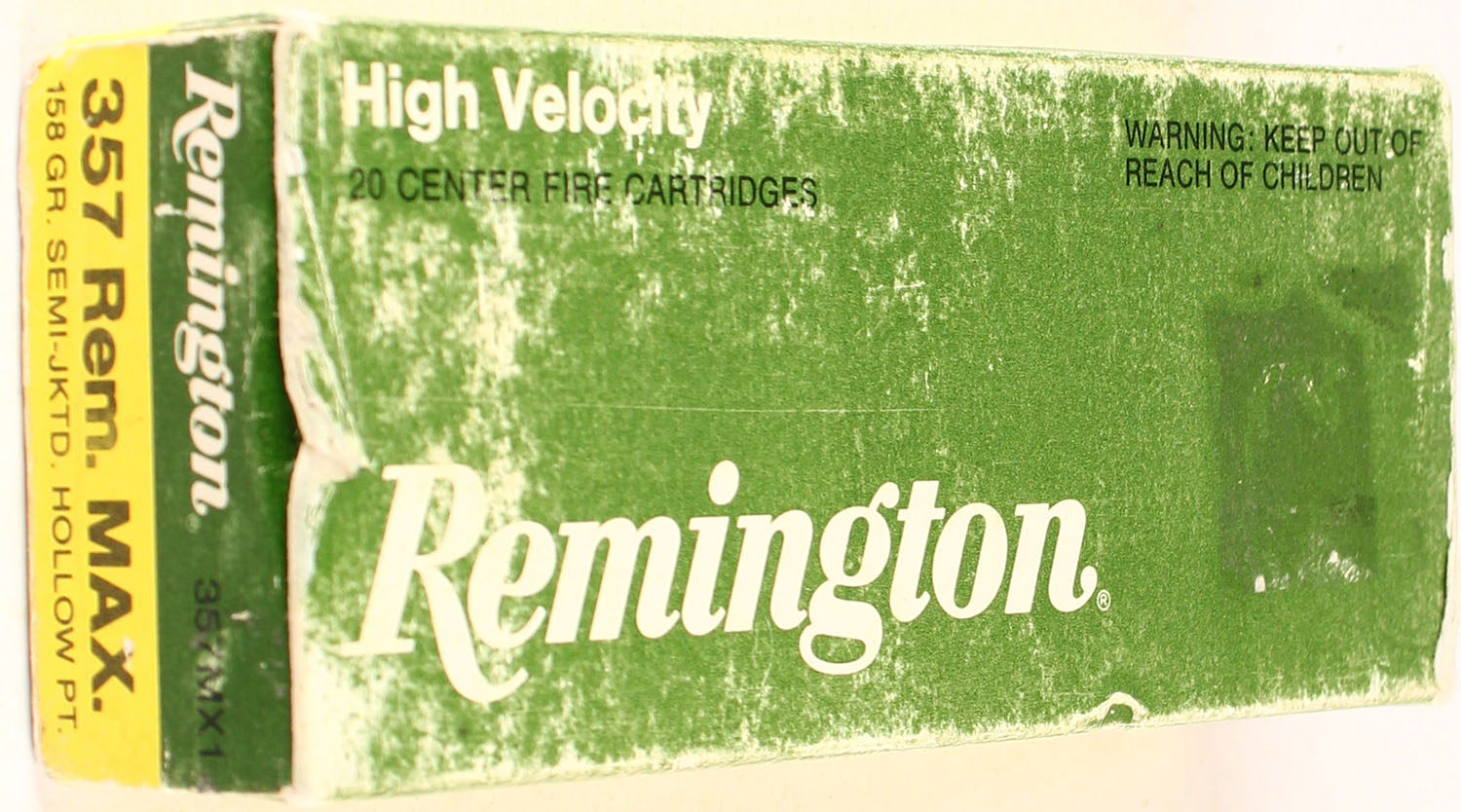 Remington 357 REM MAX, 158 Gr Semi JKTD Hollow Pt, 1pc, Full, green, yellow box, box shows edge wear, ammo is excellent. Grade: Very Good ++ - Value: 16 to 50