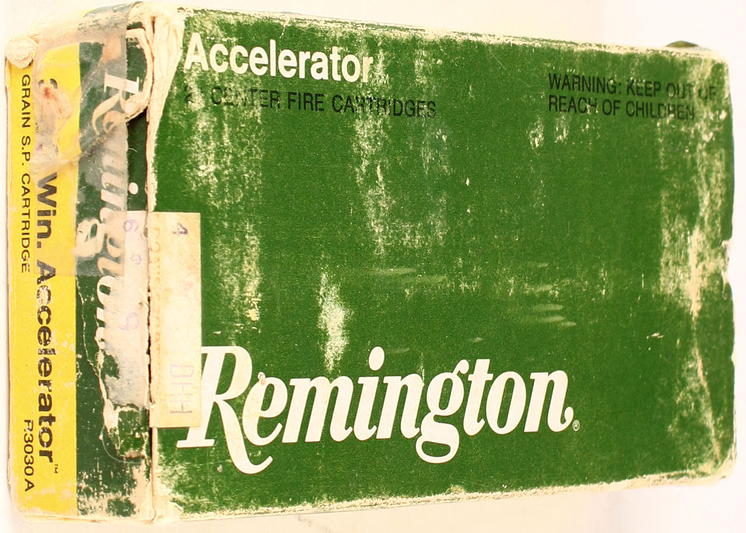 Remington, Accelerator, 30-30 Win, 55 Grain S.P Cartridge, Full, 1pc. Green, yellow & white box, box is solid, with very good color, right end flap has small seam split, shelf, edge & corner wear, ammo is excellent. Grade: Very Good - Value: 20 to 70