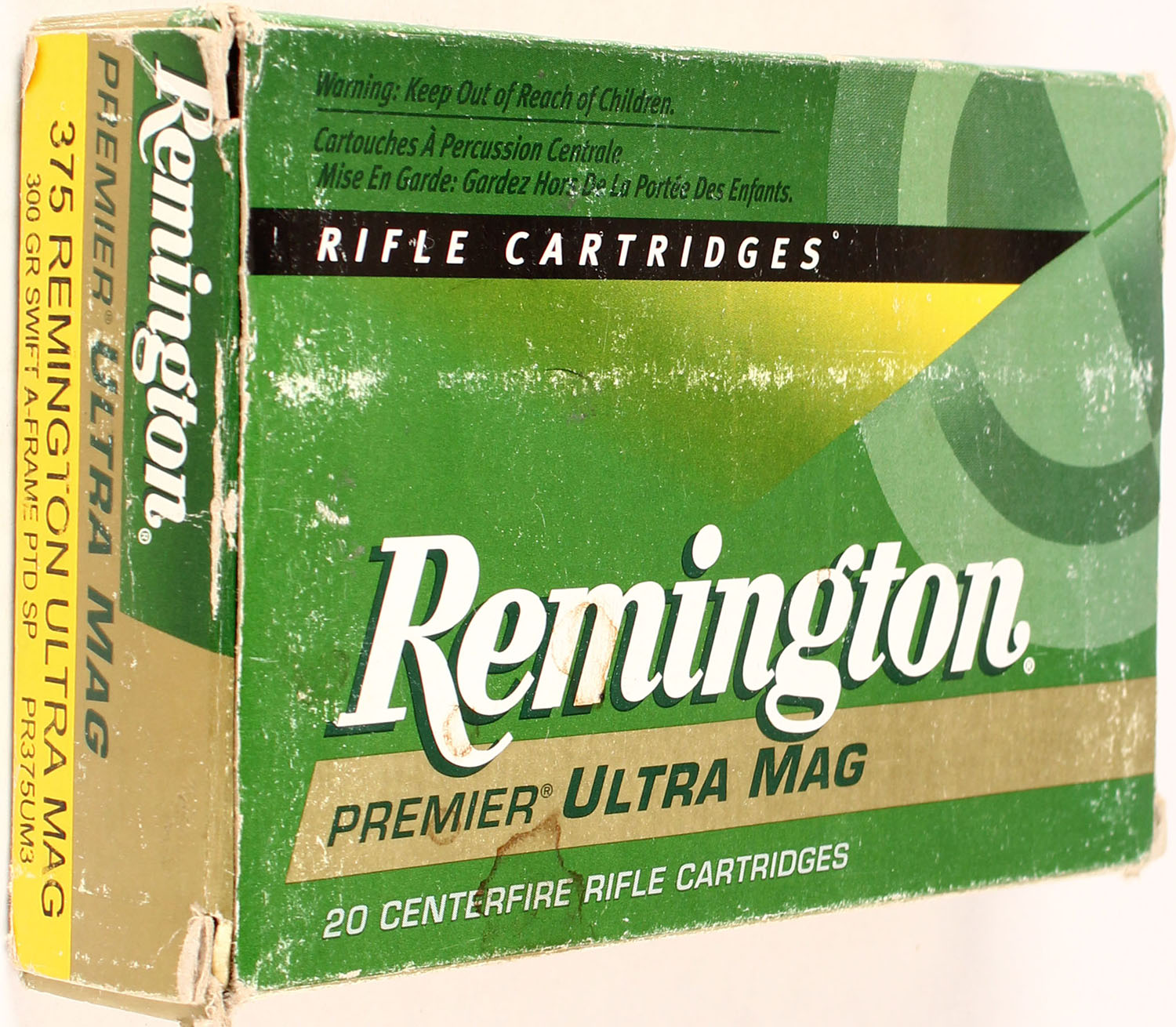 Remington, Premier Ultra Mag, .375 Remington Ultra Mag, 300 Gr Swift A-Frame Ptd Sp, Full, 1pc. Green, yellow, tan & white box, box is solid with excellent color, light shelf & corner wear, end flaps solid, ammo is excellent. Grade: Excellent - Value: 40 to 120