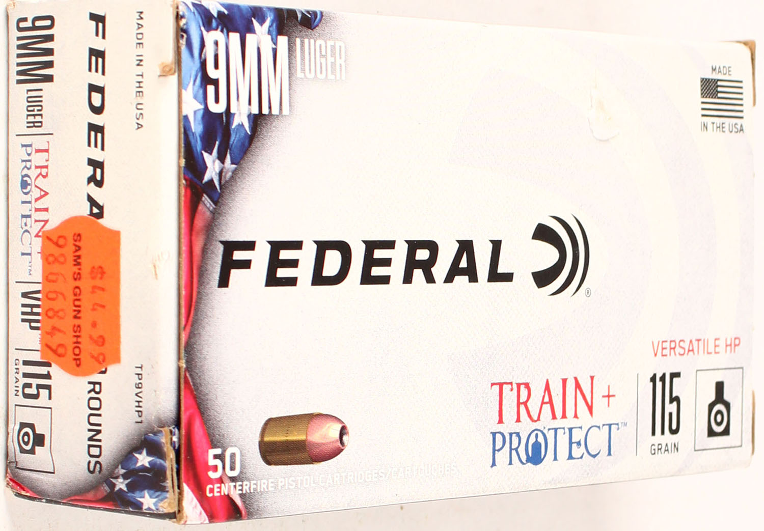 Federal, Train + Protect, 9mm Luger, 115 Grain Versatile HP, Full, 1pc. multi-colored box, box is solid with excellent color, Ammo is excellent. Grade: Excellent ++ - Value: 20 to 80