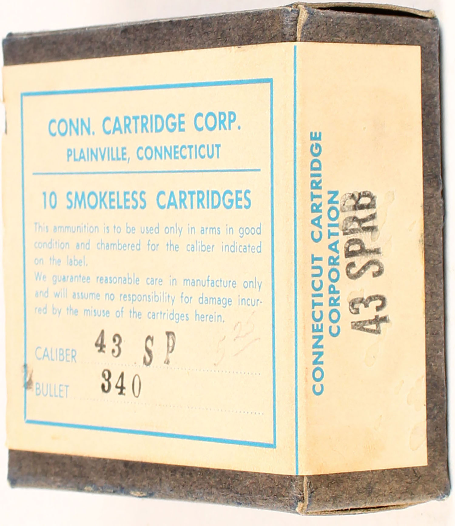 Connecticut Cartridge Co., .43 Caliber, 340 Grain Soft Point, Full, 1pc. Gray box with white label, box is solid with excellent color, only very minor age soiling, top front has been written on, very minor shelf wear, corners are mostly sharp, edges are crisp, top flap is solid, ammo is excellent. Grade: Excellent + - Value: 20 to 60