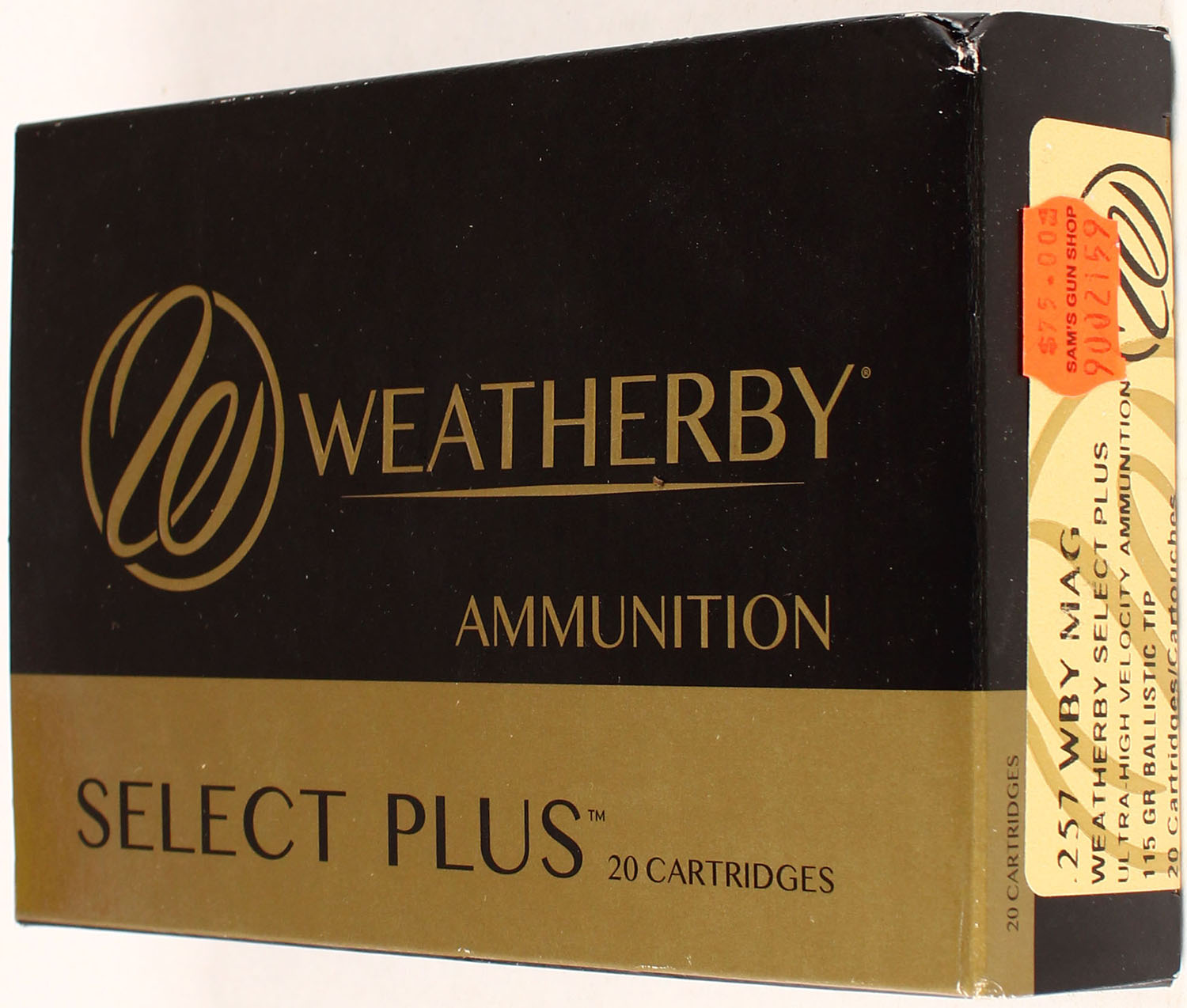 Weatherby, Select Plus, 257 WBY Mag, 115 Grain Ultra-High Velocity Ballistic, Full, 1pc. multi-colored box, box is solid with excellent color, Ammo is excellent. Grade: Excellent ++ - Value: 20 to 80