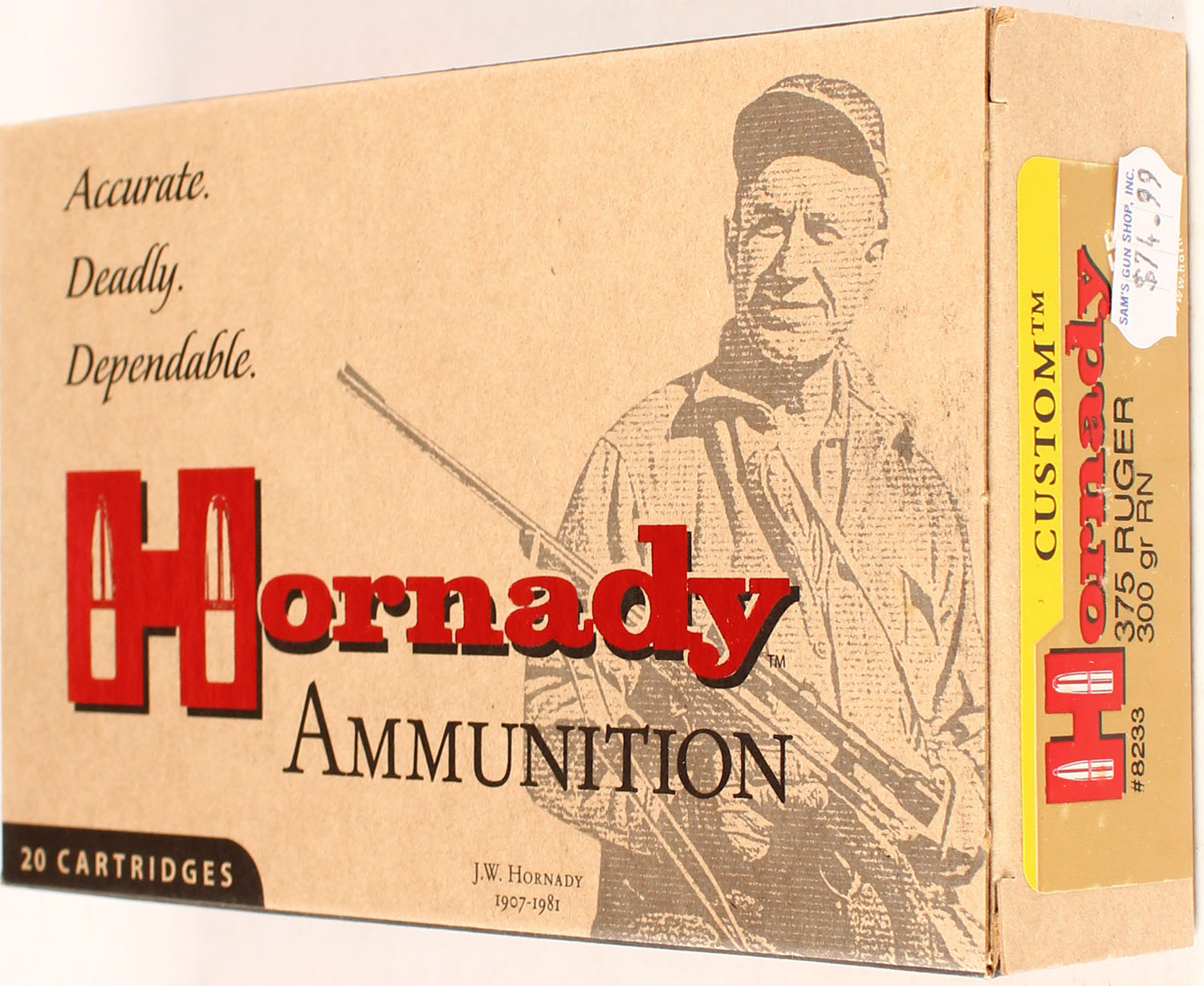 Hornady, 375 Ruger, 300 Grain RN, Full, 1pc. multi-colored box, box is solid with excellent color, Ammo is excellent. Grade: Excellent ++ - Value: 20 to 80