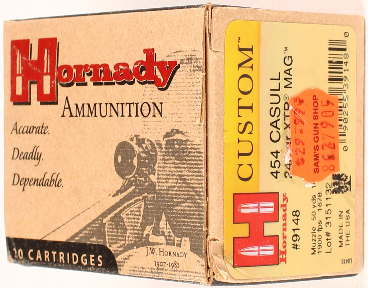 Hornady, 454 Casull, 240 Grain XTP Mag, Full, 1pc. multi-colored box, box is solid with excellent color, Ammo is excellent. Grade: Excellent ++ - Value: 20 to 80