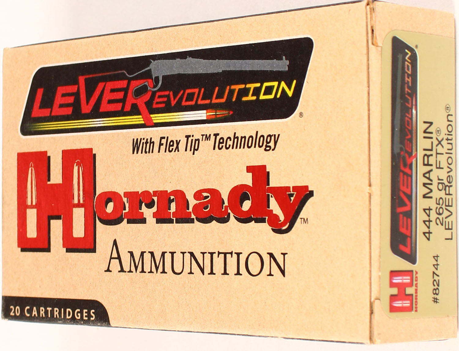 Hornady, LeveRevolution, 444 Marlin, 265 Grain FTX, Full, 1pc. multi-colored box, box is solid with excellent color, Ammo is excellent. Grade: Excellent ++ - Value: 20 to 80