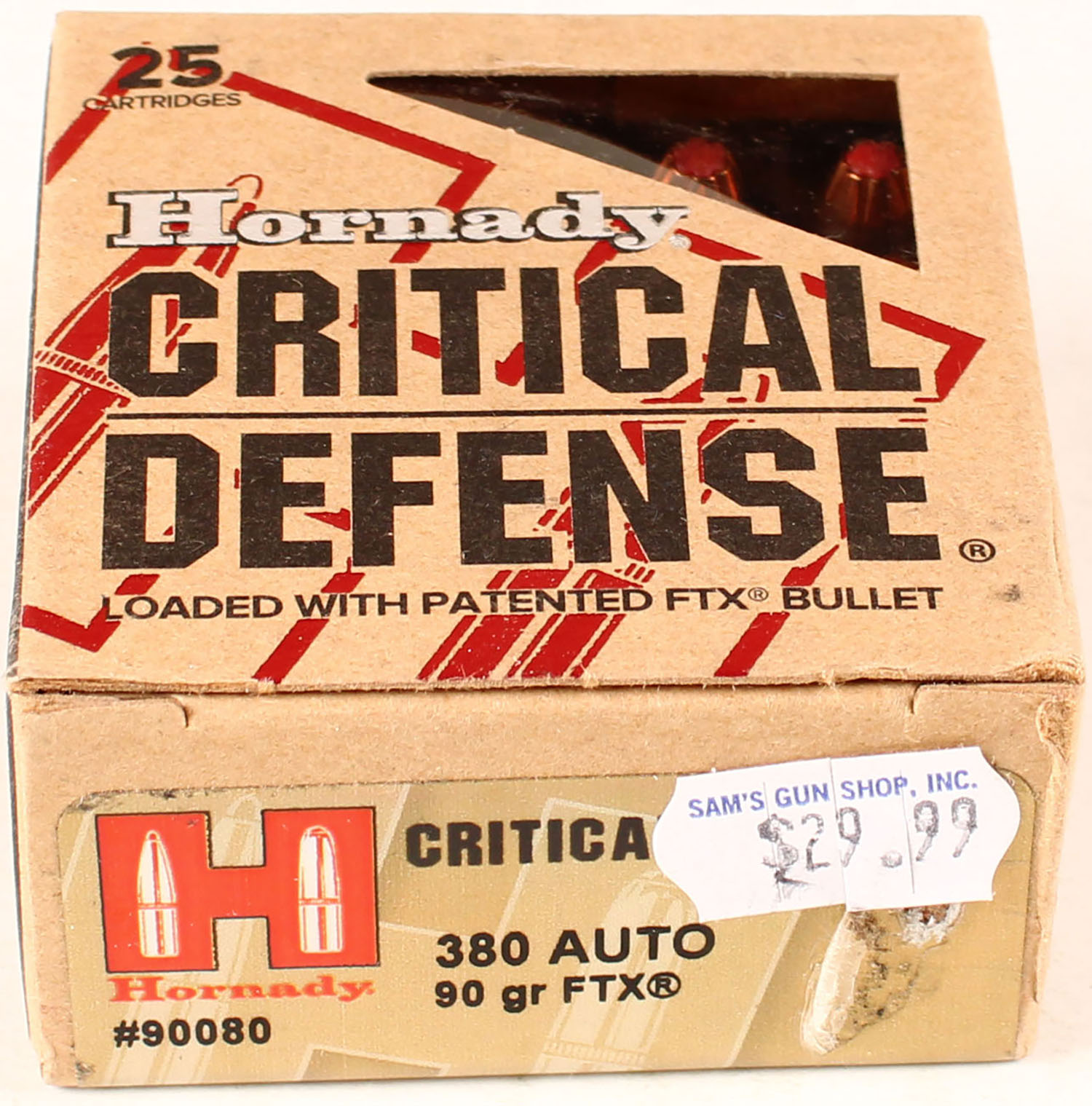 Hornady, Critical Defense, 380 Auto, 90 Grain FTX, Full, 1pc. multi-colored box, box is solid with excellent color, Ammo is excellent. Grade: Excellent ++ - Value: 20 to 80