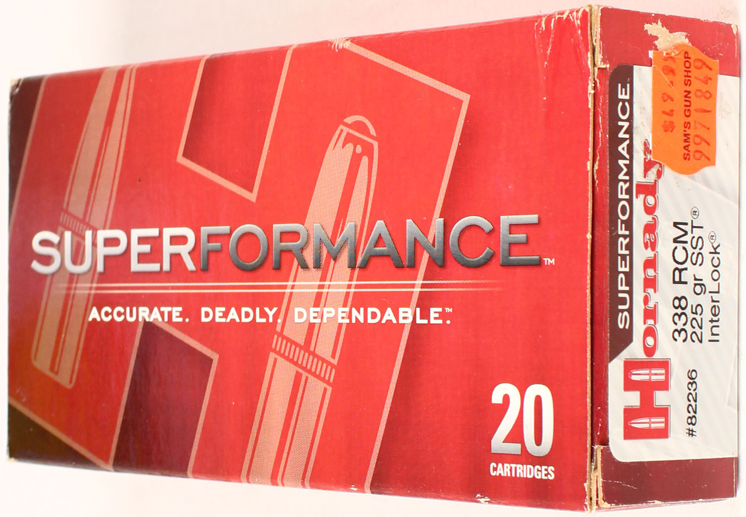 Hornady, Superformance, 338 RCM, 225 Grain SST Interlock, Full, 1pc. multi-colored box, box is solid with excellent color, Ammo is excellent. Grade: Excellent ++ - Value: 20 to 80