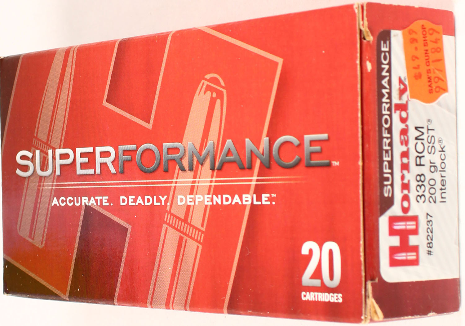Hornady, Superformance, 338 RCM, 200 Grain SST Interlock, Full, 1pc. multi-colored box, box is solid with excellent color, Ammo is excellent. Grade: Excellent ++ - Value: 20 to 80