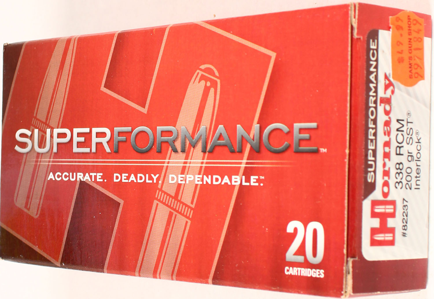 Hornady, Superformance, 338 RCM, 200 Grain SST Interlock, Full, 1pc. multi-colored box, box is solid with excellent color, Ammo is excellent. Grade: Excellent ++ - Value: 20 to 80