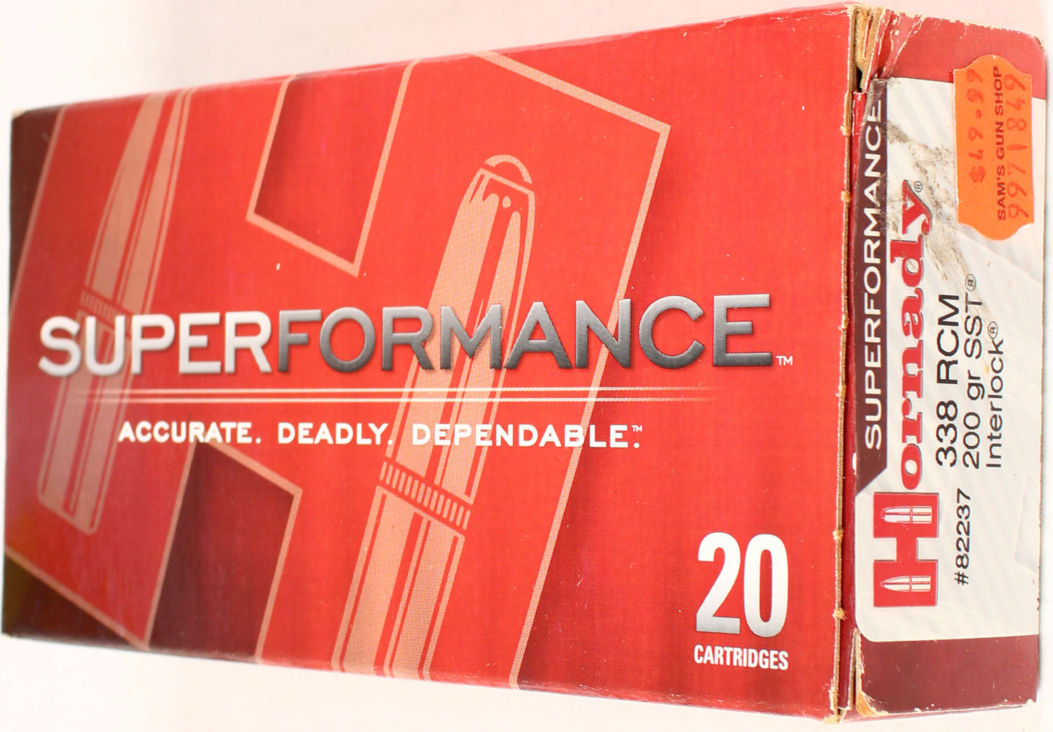 Hornady, Superformance, 338 RCM, 200 Grain SST Interlock, Full, 1pc. multi-colored box, box is solid but has damage to corner with excellent color, Ammo is excellent. Grade: Excellent + - Value: 20 to 80