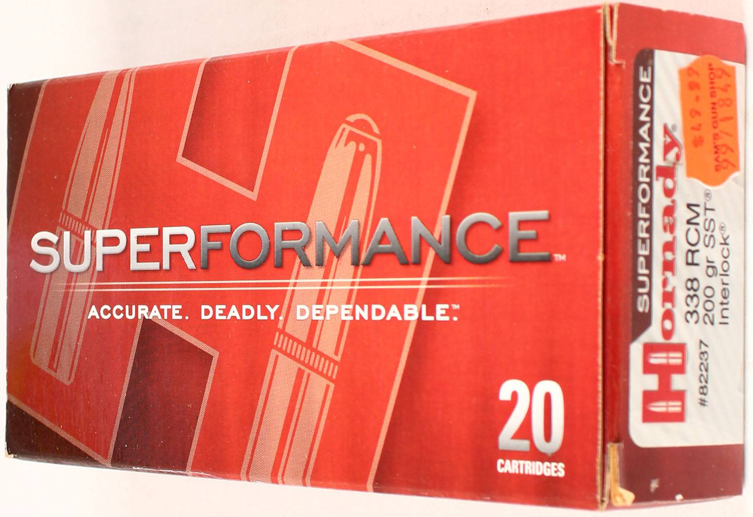 Hornady, Superformance, 338 RCM, 200 Grain SST Interlock, Full, 1pc. multi-colored box, box is solid with excellent color, Ammo is excellent. Grade: Excellent ++ - Value: 20 to 80
